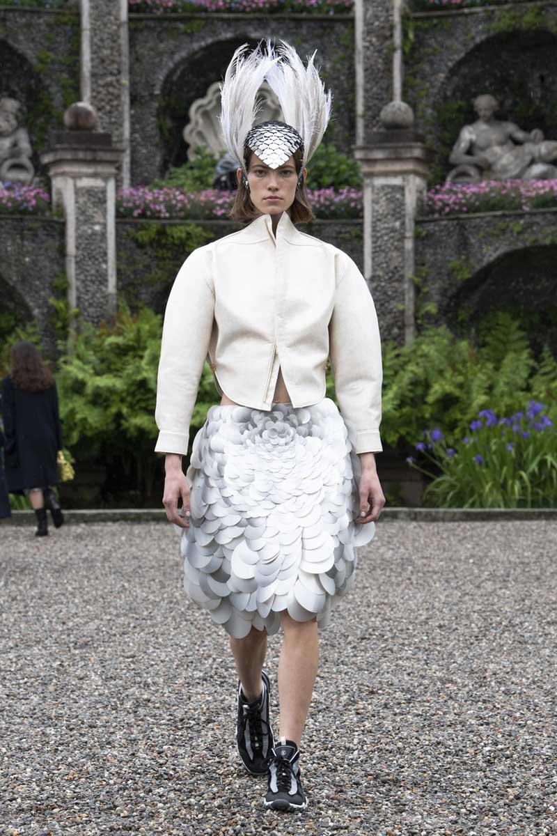 Los jardines, un paraje de verdadero ensueño, están coronados por el Atrio de Diana; una edificación llena de figuras mitológicas que adelantan lo que nos contaba Louis Vuitton Cruise 2024: un cuento de hadas que habla de la metamorfosis de una criatura marina para descubrir las maravillas del mundo terrestre. Este relato se dividió en tres actos muy marcados que vimos en los looks de la colección. En primer lugar, una criatura completamente marina; escamas, aletas de tritones y medusas sugerían la fantasía. El punto medio es la sirena, una criatura mitad pez, mitad humana que se reflejaba en prendas, cortes y tejidos innovadores. Finalmente tenemos a la humana, presentada como una princesa del barroco con vestidos de verdadero ensueño.