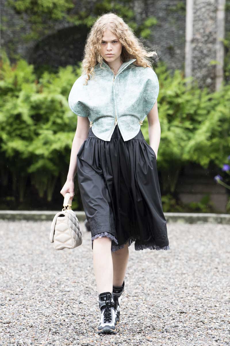 En la misma nota acuática se presentaron tres propuestas muy interesantes de faldas. De corte midi y con una silueta boxy, estas creaciones escamosas presentadas en blanco, negro-azul y plateado canalizaron a la perfección cómo sería una sirena vistiera de Louis Vuitton. Para acompañar a estas creaciones, se conjuntaron con chaquetas de hombros exagerados de corte cropped y mangas abullonadas de inspiración neo barroca… otro de los highlights de esta colección que desarrollaremos más adelante.