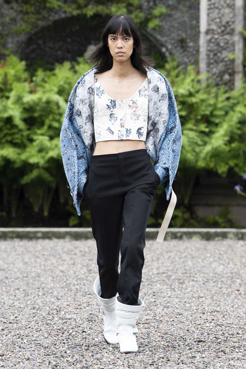 Abriendo el primer acto de este relato vimos a la criatura acuática, nadando en el agua con prendas construidas en neopreno con proporciones verdaderamente únicas. Chaquetas, tops y faldas de neopreno las compuertas (y nunca antes mejor dicho) de esta inundación de fantasía. Estos primeros looks resaltaron por sus estampados con temáticas marinas y acuáticas y por sus singulares cuellos y y volantes con forma de escalas de tritón. La colección siguió inmediatamente con otras prendas en neopreno, pero mucho más toned down: pantalones tipo scuba, monos utilitarios y bodys perfectos para un look playero tendencia.