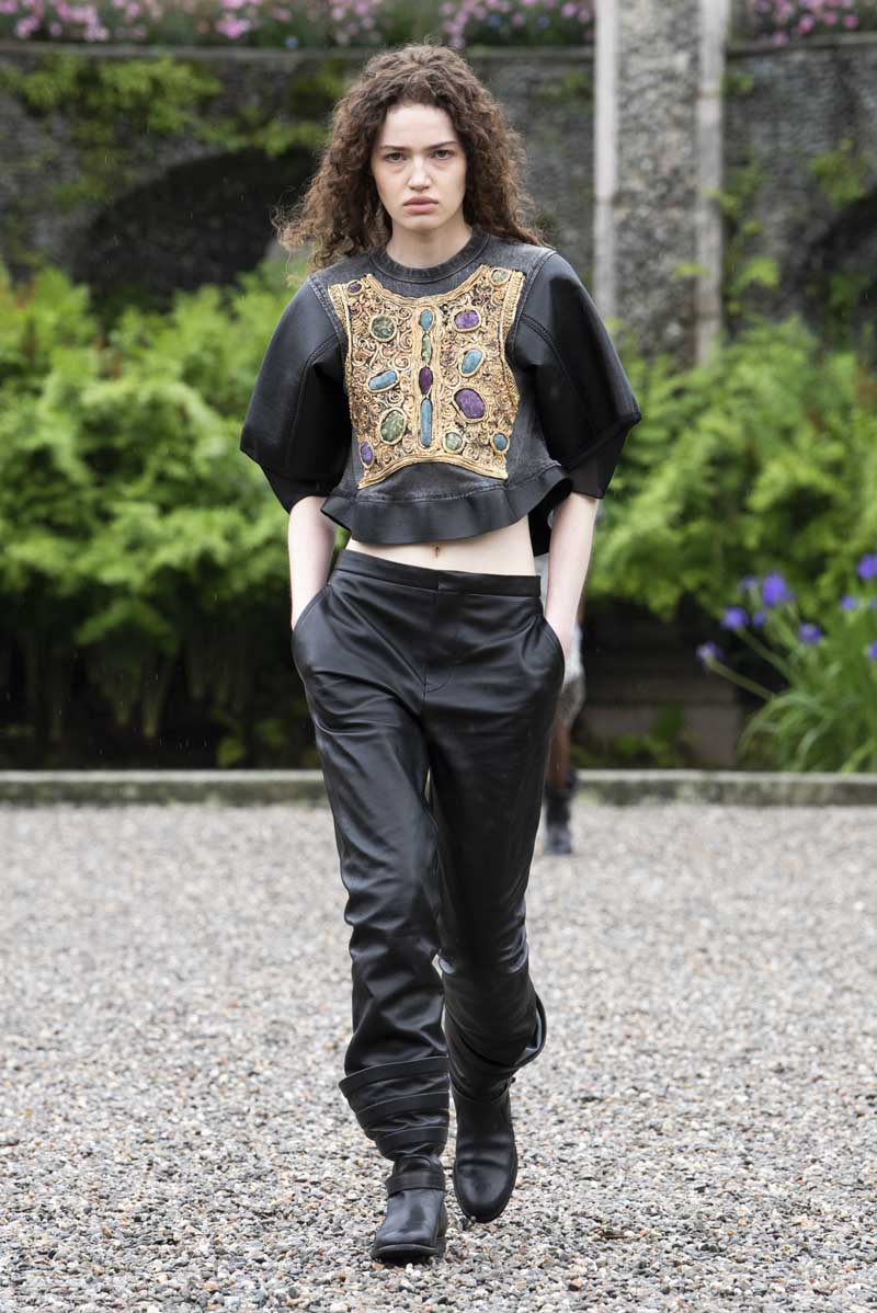 Las chaquetas cropped que acompañaban a estas faldas de escamas sirvieron de antesala para demostrarnos una de las siluetas claves de Louis Vuitton para su colección Cruise 2024. Tops, cazadoras y parkas se presentaban con hombros que hacían una silueta ovalada y muy moderna; pero para llevar las cosas al barroco, estas prendas venían confeccionadas en tejidos y jacquards florales muy delicados… para no perder el hilo temporal.
