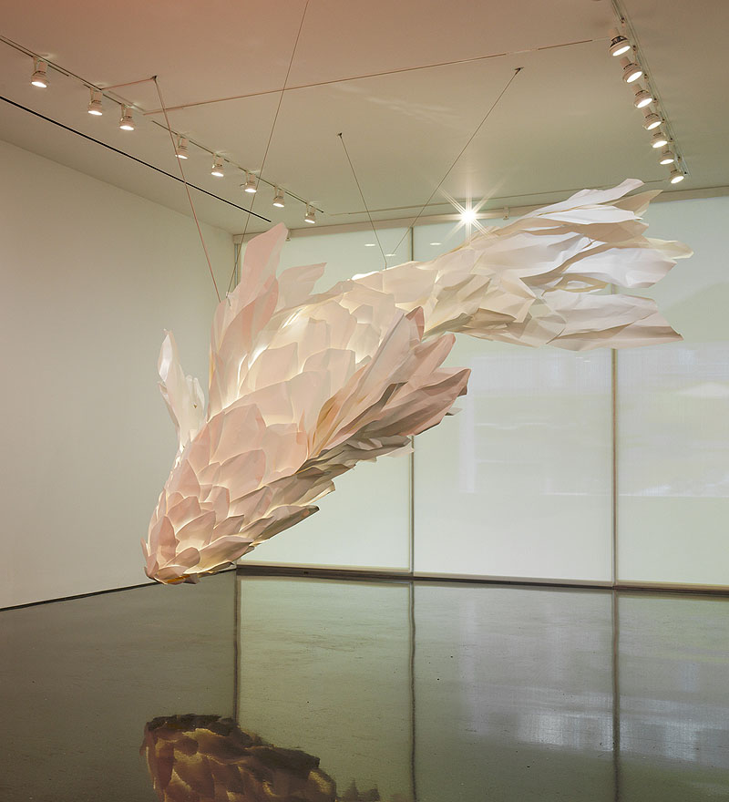 Una de las piezas más destacadas de la exposición es un monumental pez blanco colgante, que simboliza la visión arquitectónica de Gehry. Esta escultura, que combina fuerza y flexibilidad, resalta la aerodinámica característica de sus estructuras y se complementa con un gran arco de listones dispuestos geométricamente. La obra también refleja la influencia de las artes visuales japonesas en su trabajo.