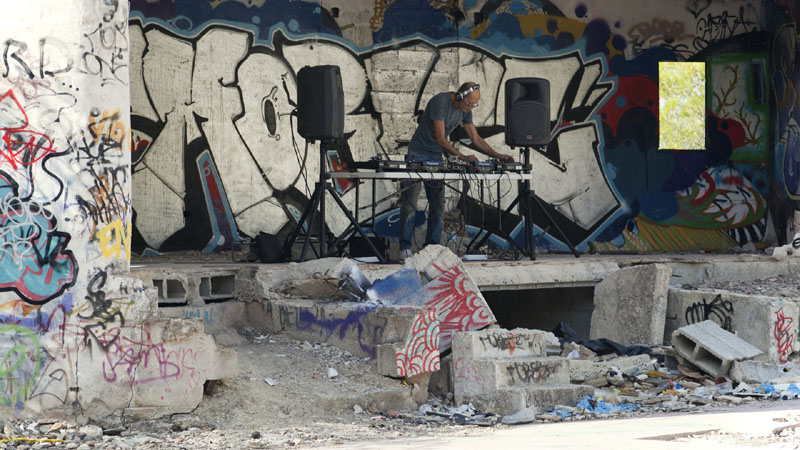 Dj Alfredo Florito, habitual en la noche ibicenca en los 80 pincha una sesión de baleric y house en el ruinoso escenario del Festival Club, el que fuera enorme complejo de dos escenarios, restaurante al aire libre y hasta un pequeño coso para capeas, situado en la ladera de una montaña de San José, Ibiza.