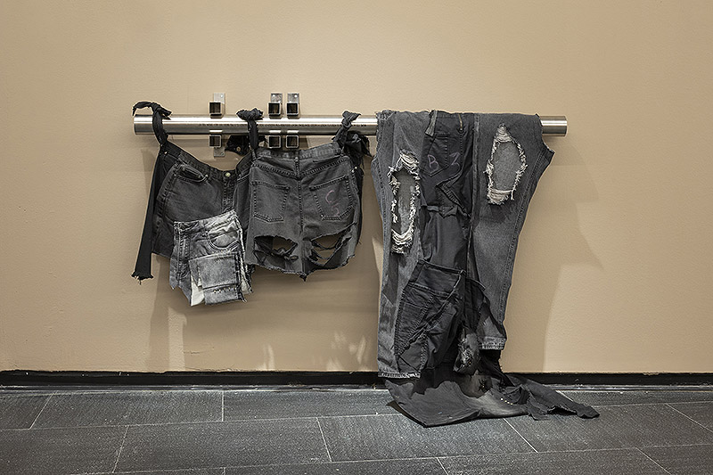 La segunda línea de investigación, ubicada en la sala por la que se accede al conjunto, se centra en el uso escultórico de la tela vaquera. El denim —ya recurrente en exposiciones previas de Lucía C Pino— funciona aquí como un tejido cargado de memoria histórica: desde su papel como ropa de trabajo en plantaciones esclavistas del sur estadounidense hasta su transformación en icono global de la moda.