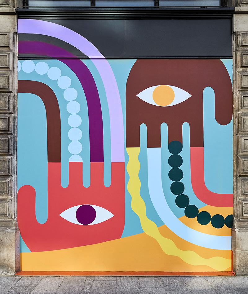 Luckylefthand nos comenta: “He creado esta pintura, para ofrecer a los parisinos un colorido paseo a través de 14 ventanas, que evocan unas vacaciones de verano, mientras que todavía, representan el período que estamos atravesando actualmente. Las manos colocadas a 1 metro y medio de distancia, son un guiño a la distancia que tenemos que mantener estos días. Espero que esta pintura mural de brillantes y saturados colores, realizada con grandes líneas curvas, traiga la energía positiva que todos necesitamos ahora mismo”.