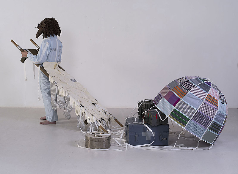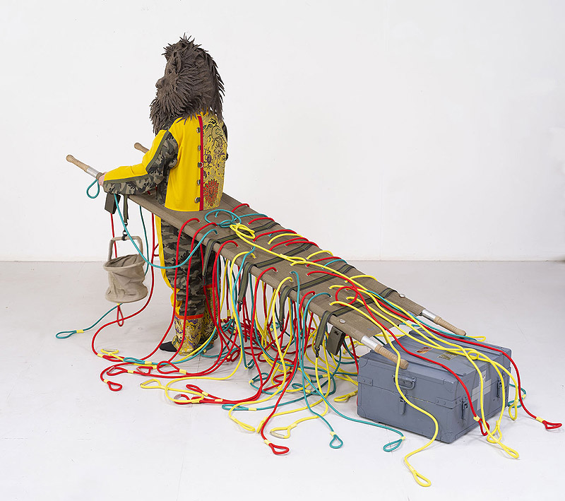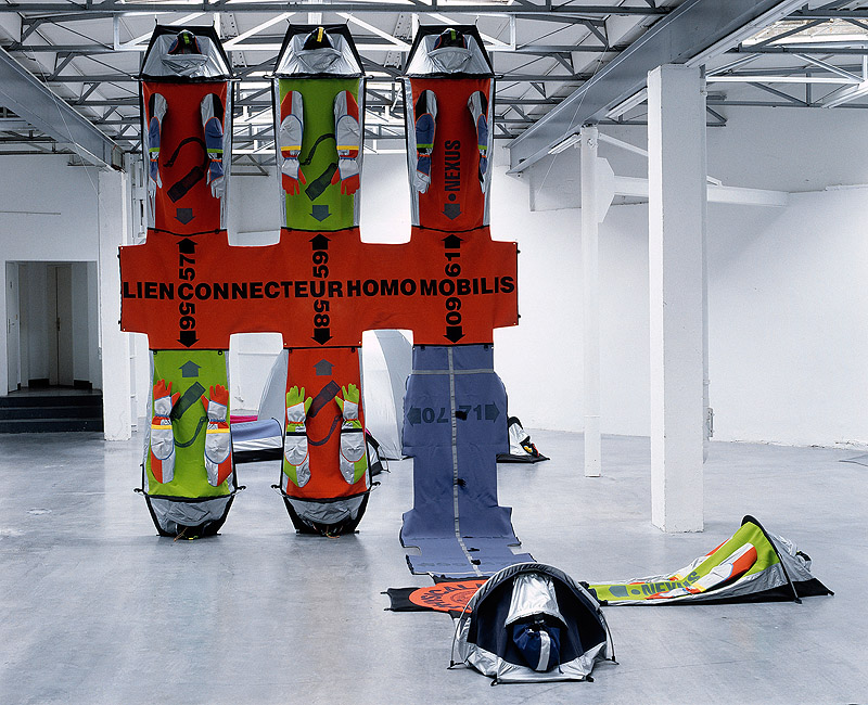 Lucy Orta: Nuestros trabajos se desarrollan a lo largo de varios años. Comencé a crear la serie Life Guard en 2002 y por esa época el ejército francés vendía su equipo de primeros auxilios obsoleto, así que compramos el contenido de un hospital de campaña militar, que incluía ambulancias, camillas, catres, mantas de hospital, sábanas y una variedad de suministros médicos.Estos objetos estaban tan cargados de significado: ¡Habrían sido utilizados para salvar vidas! Empecé a explorar formas de usar las camas plegables y las camillas, ya que estos eran los objetos más cercanos al cuerpo. En algunos casos, la huella del ser humano quedó en las lonas de lino, o se mancharon por el uso. Simbolizaban la fragilidad de un cuerpo frente a la horrible máquina de guerra, los objetos estaban asociados al sufrimiento, pero también al cuidado humano.