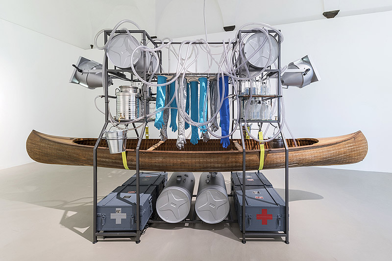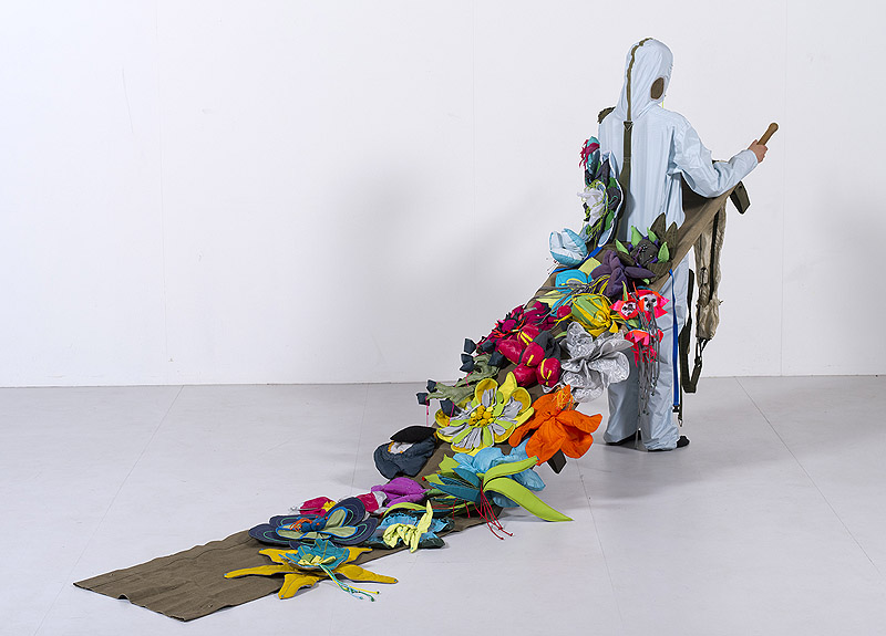 Quité las lonas de lino del marco, incorporé vivacs para realzar la noción de protección, inserté overoles para reflexionar sobre la capacidad humana de superar las pruebas, y lo hice para presentar una figura que ,de forma simultánea, era cargada y cargaba a alguien (Life Guard, Curve Gallery, Barbican London, 2005). Utilicé la lona como lienzo sobre el que cosí objetos: cantimploras para llevar agua a alguien sediento (Life Guard – OrtaWater, 2005), o flores textiles gigantescas para evitar que desaparecieran (Life Guard Amazonia, 2016).