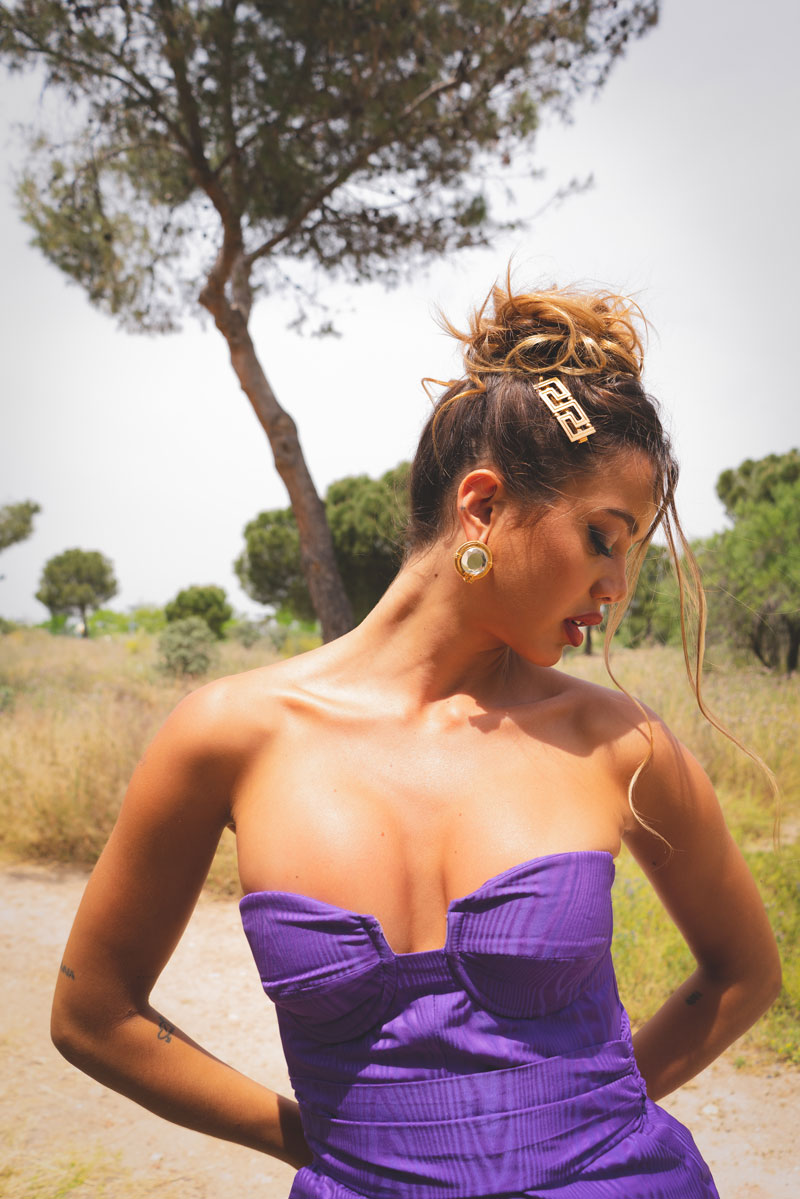 Luna Sobrino con vestido Koahari, pendientes Versace, horquilla Versace