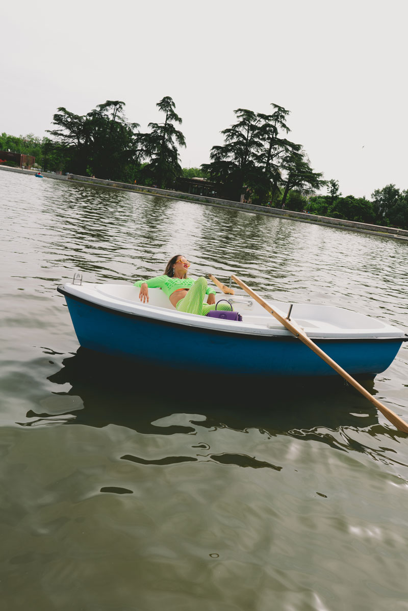 Luna Sobrina con top: The Curiousers, short Sandro, visera Karl Lagerfeld, zapatos Versace, bolso Furla, anilos KiwiPomelo