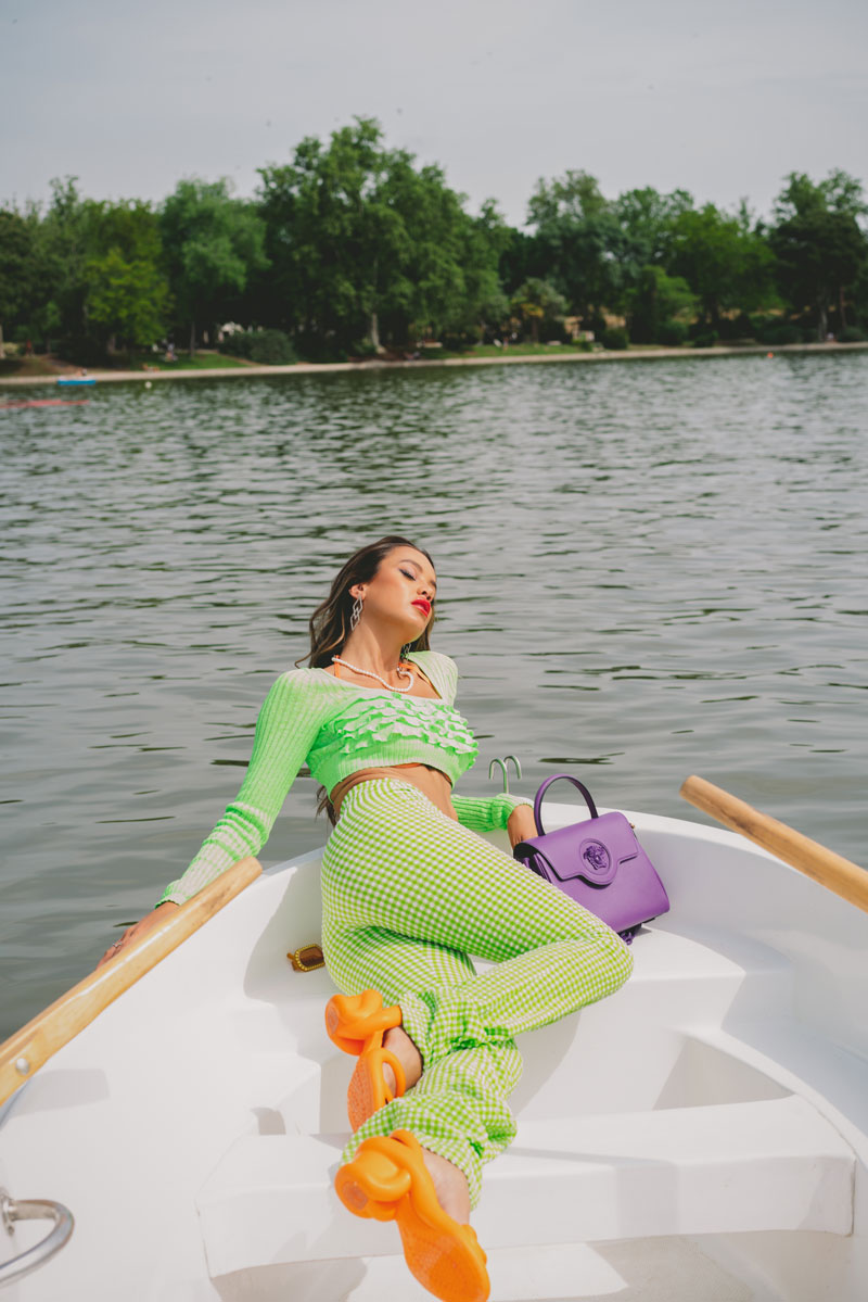 Luna Sobrino con bikini Tezenis, top MSGM, pantalón MSGM, bolso Versace, collar TwoJeys, pendientes: SoulBask, anillos SoulBask y TwoJeys