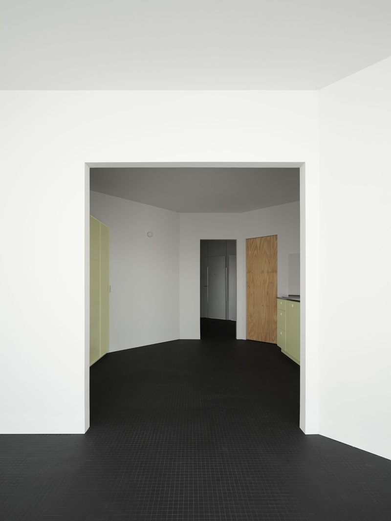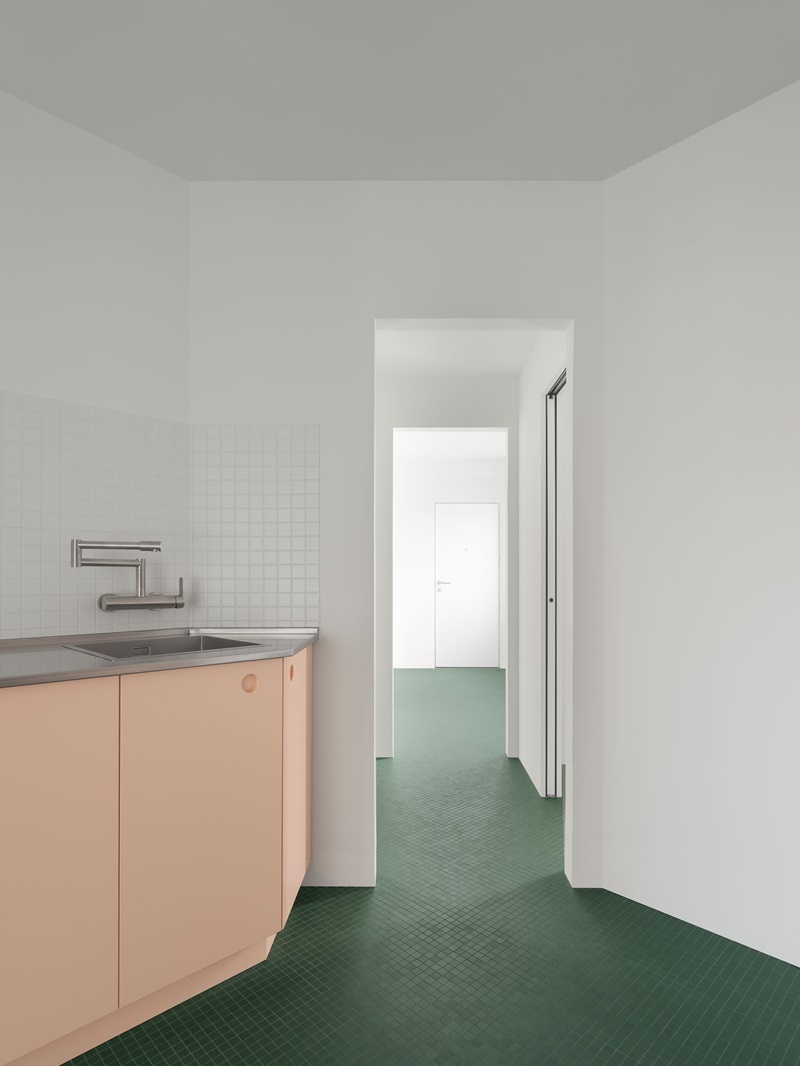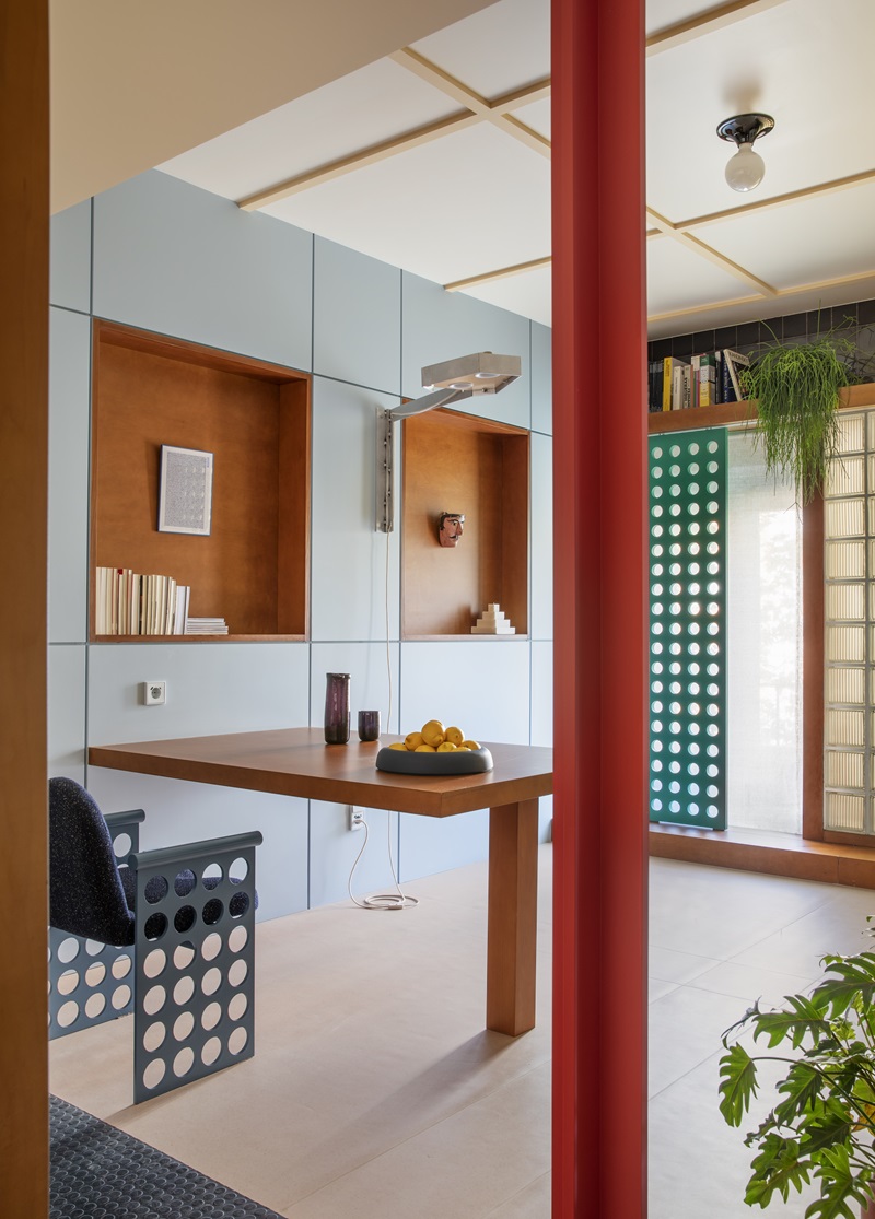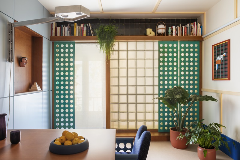 Proyecto destacado: Casa Gracia (2023): “Casa Gracia surge de una distribución ‘doppelgänger’, que permite convertir una vivienda de los años 70 en dos apartamentos casi simétricos, con un sistema espacial de habitaciones hexagonales interconectadas. En cada casa, el elemento más distintivo es el sobrio color del suelo continuo con textura de mosaico (uno en verde y otro en negro), que contrasta con la paleta de colores pastel del mobiliario. El proyecto ha supuesto avanzar un paso más en nuestra exploración sobre plantas ineficientes”.