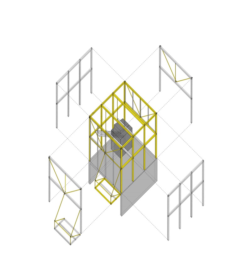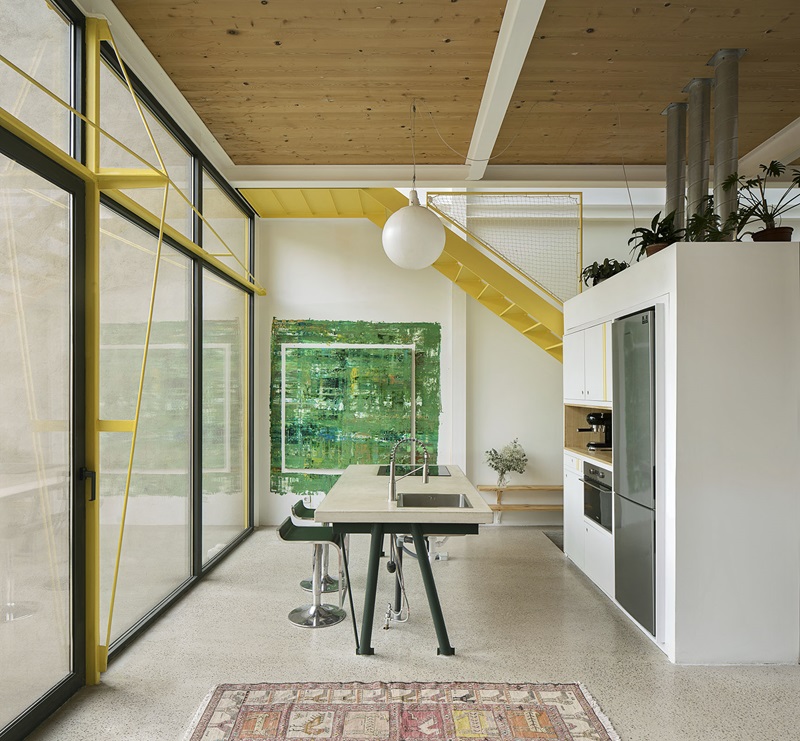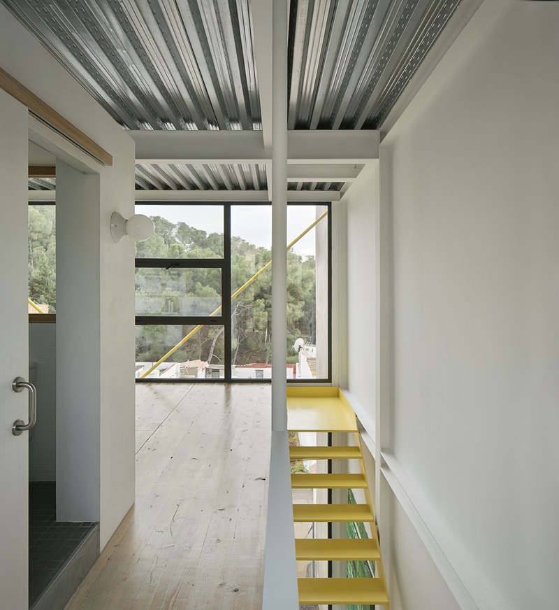 La nueva vivienda se construye a partir de una estructura metálica ligera apoyada sobre un basamento pesado. En el interior, los espacios están organizados en torno a “una pieza central que hace las funciones de baño y almacenamiento. Los diferentes muebles, algunos de obra, terminan de construir las estancias. En un intento de aportar alegría al entorno, decidimos pintar de color amarillo la casa, abierta a la luz del sol, al verde del paisaje y el azul del cielo”, detallan los arquitectos.