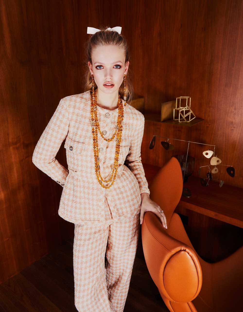 Moda: Chaqueta en tweed bicolor con detalle de paillettes; collar en metal, piel y strass; todo de CHANEL. Pendientes Coco Crush en oro beige de 18K de CHANEL Joaillerie. Anillos Coco Crush en oro amarillo de 18K y diamantes de CHANEL Joaillerie.