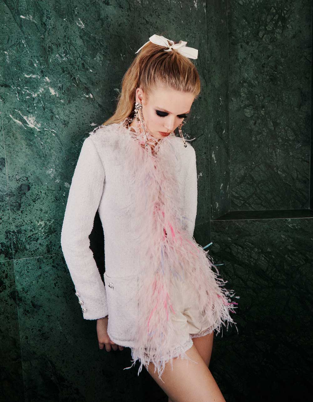 Moda: Chaqueta en tweed; top y shorts en punto y paillettes; pendientes, collar y anillo en metal, cristal y strass; botas con detalle de strass y lazo. Todo de CHANEL