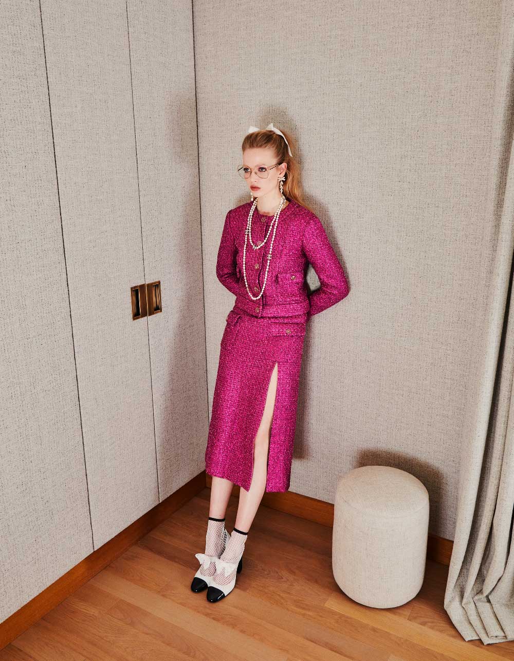 Moda: Chaqueta y falda en tweed metalizado; gafas con montura metálica; pendientes en metal, cristal y strass; collar de perlas, metal y cristal; botines bicolor con detalle de lazo. Todo de CHANEL