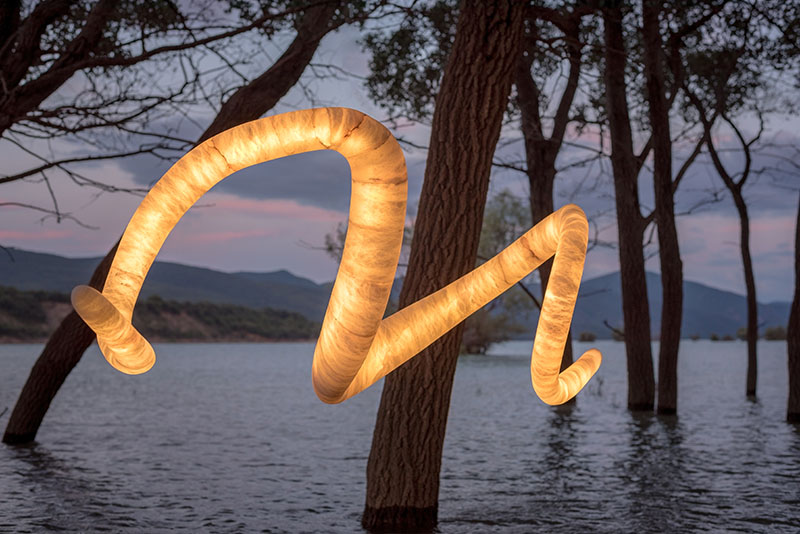 Otro ejemplo es Aqua Fossil Oda, una pieza de Amarist, estudio formado por Aran Lozano y Clara Campo. Forma parte de Metamorfosis: un proyecto en el que lámparas esculturales dialogan con el paisaje y establecen una reflexión sobre el agua. La pieza central es la escultura más grande que se ha hecho en alabastro, mide 3 my pesa 300 kg. Para Madre Natura han producido una versión más reducida, de 90 cm y 28 kg. La obra pone de manifiesto la problemática de los recursos naturales, en especial la escasez del agua, tratando de visualizar un futuro donde el agua ha pasado a estado fósil. Proyecto financiado por el Gobierno de Aragón.