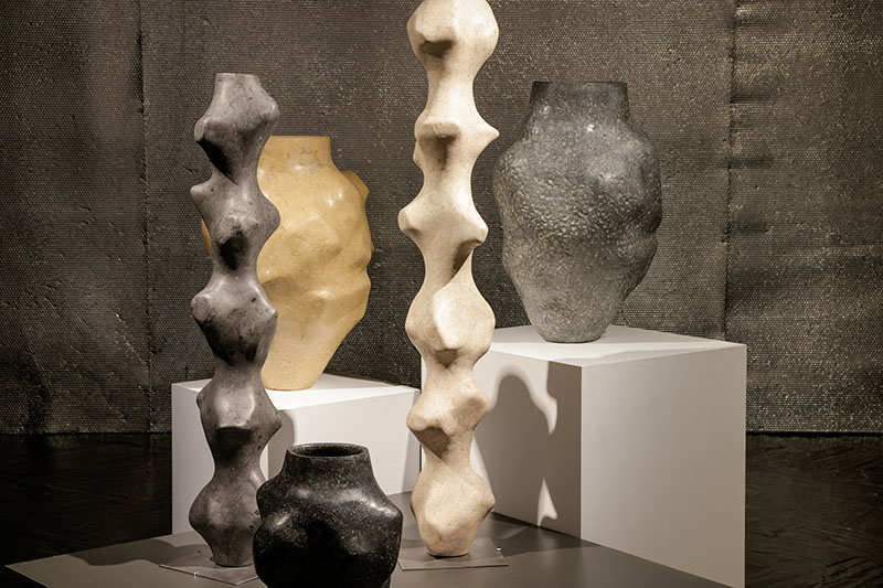 Tierra Natura se ha estructurado en cuatro espacios con nombres muy ligados al origen clásico de la naturaleza: la tierra, el fuego, el aire y el agua. Nos encontramos con diseños como los de Lucas Muñoz, Livingstone que son asientos que está realizados con piedras recogidas de la Sierra de Guadarrama. También descubrimos el trabajo de Omayra Maymó, Malta III es un proyecto en el que la diseñadora madrileña habla del aprovechamiento de recursos, y en el que reutiliza los residuos de la cebada que quedan después del proceso de fabricación de cerveza. Con ellos hace un nuevo material compuesto orgánico-inorgánico (malta-cemento) con propiedades mejoradas. Un proyecto que va evolucionando a partir del proyecto desarrollado con un premio de Neo2 en 2020.