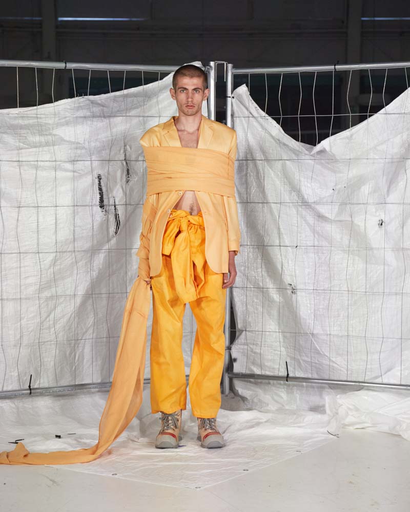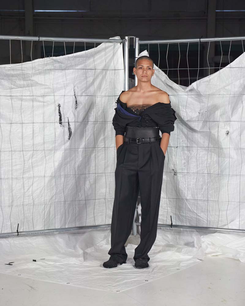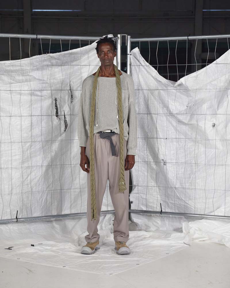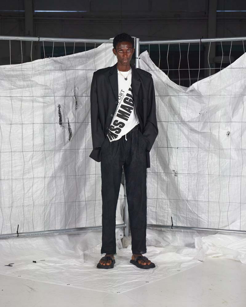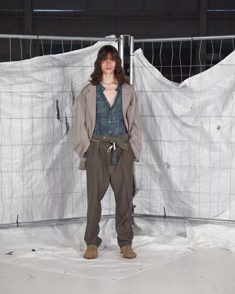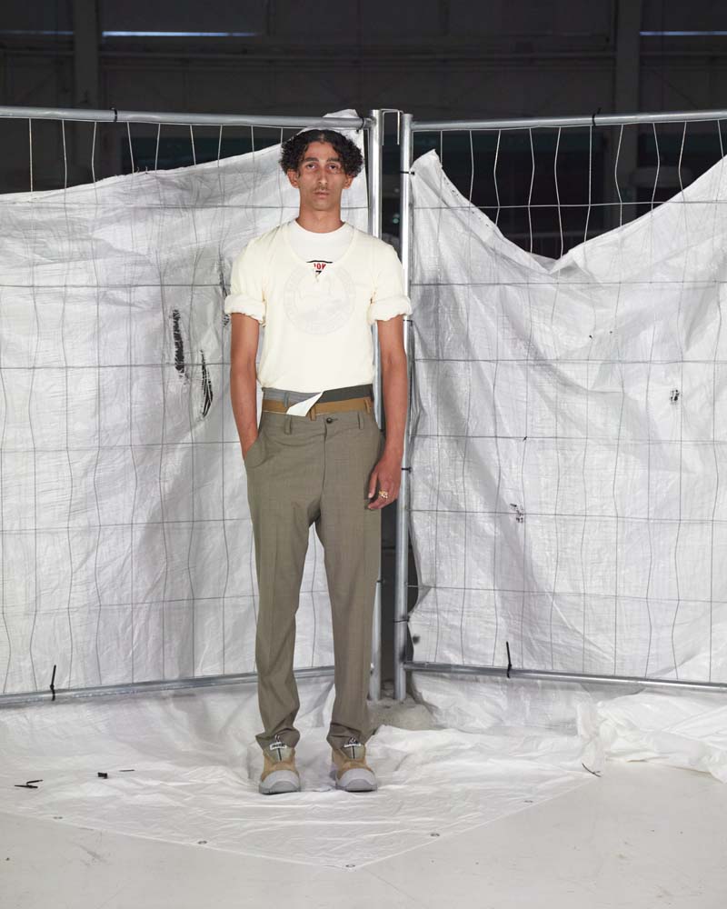 Otro de los puntos fuertes es la sastrería; vista en esta colección como un elemento subversivo que presenta americanas de proporciones experimentales y hombros caídos. La deconstrucción también se hace notar en esta oferta, donde pedazos de la misma tela sirven como elementos de constricción para el cuerpo; por supuesto, los pantalones de pinzas se imaginan a juego con sus complementos superiores, de corte baggy amontonándose sobre el calzado (que bebe inspiración de tendencias dosmileras de calzado).
