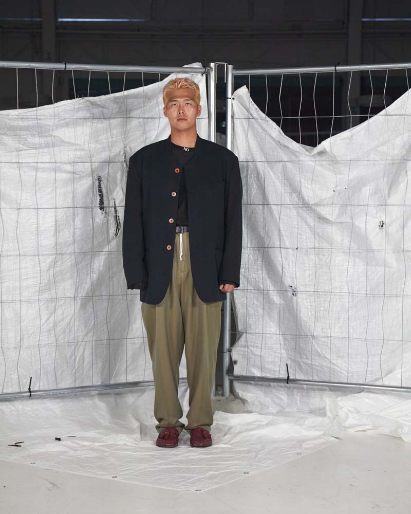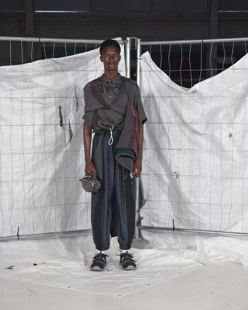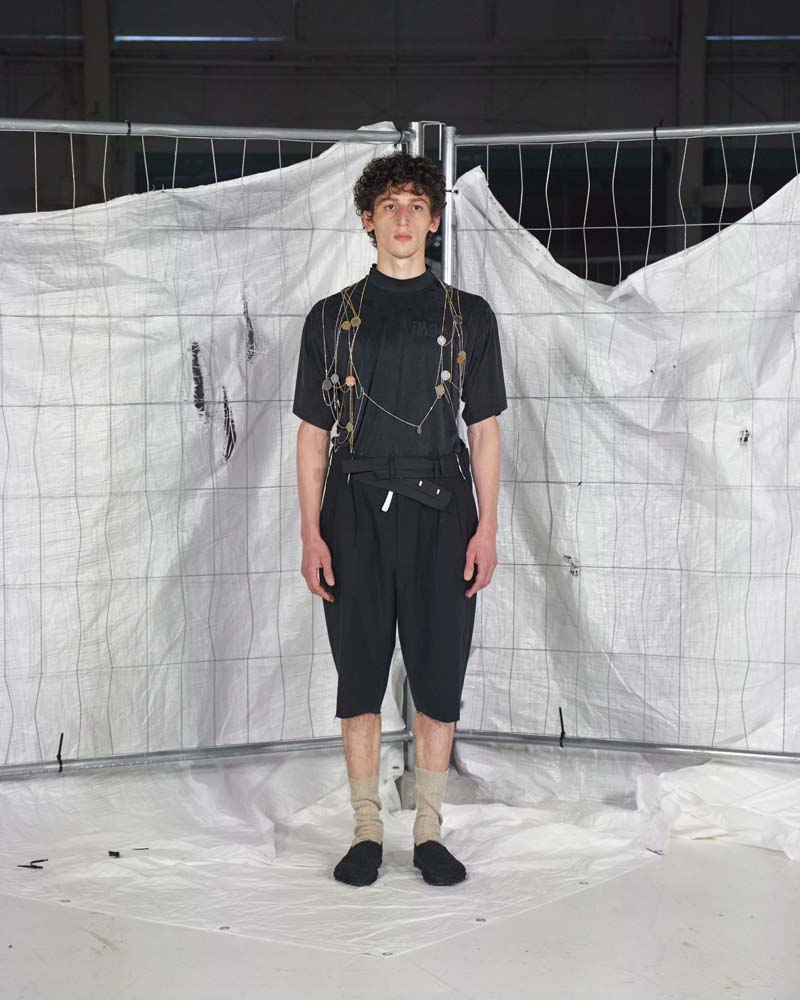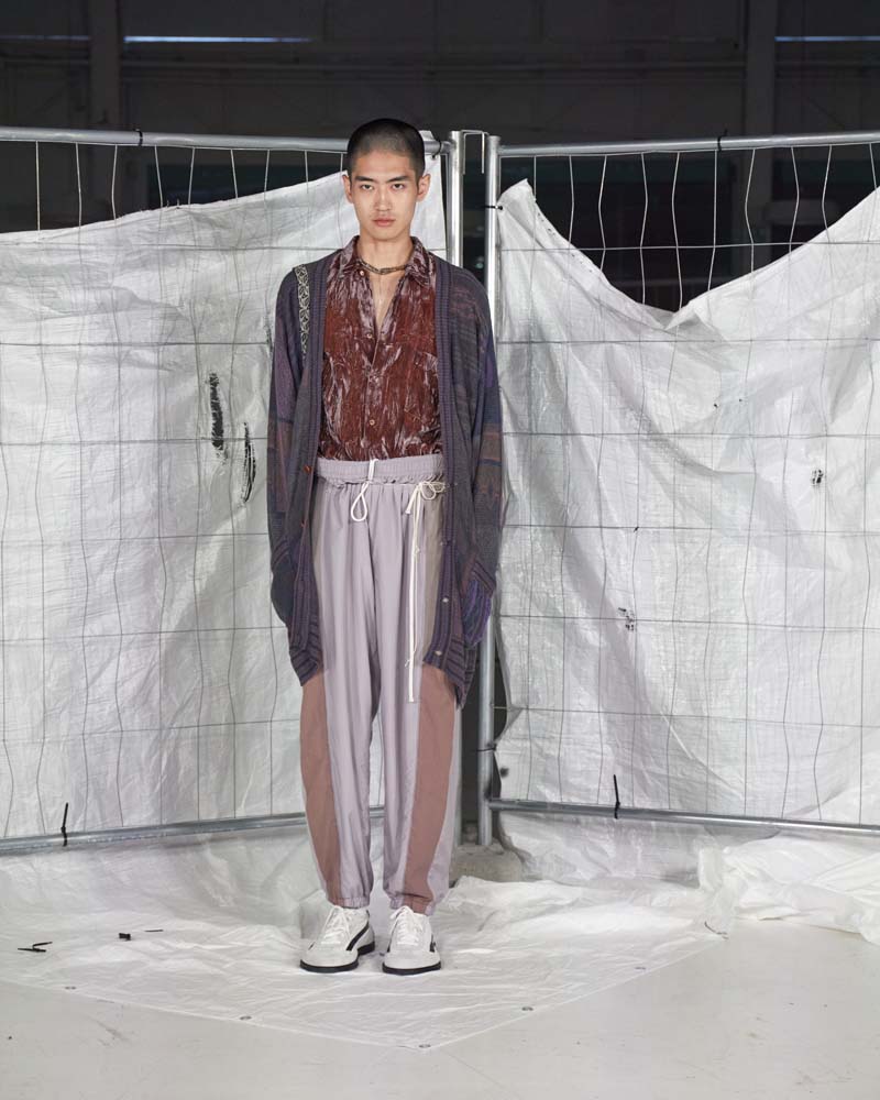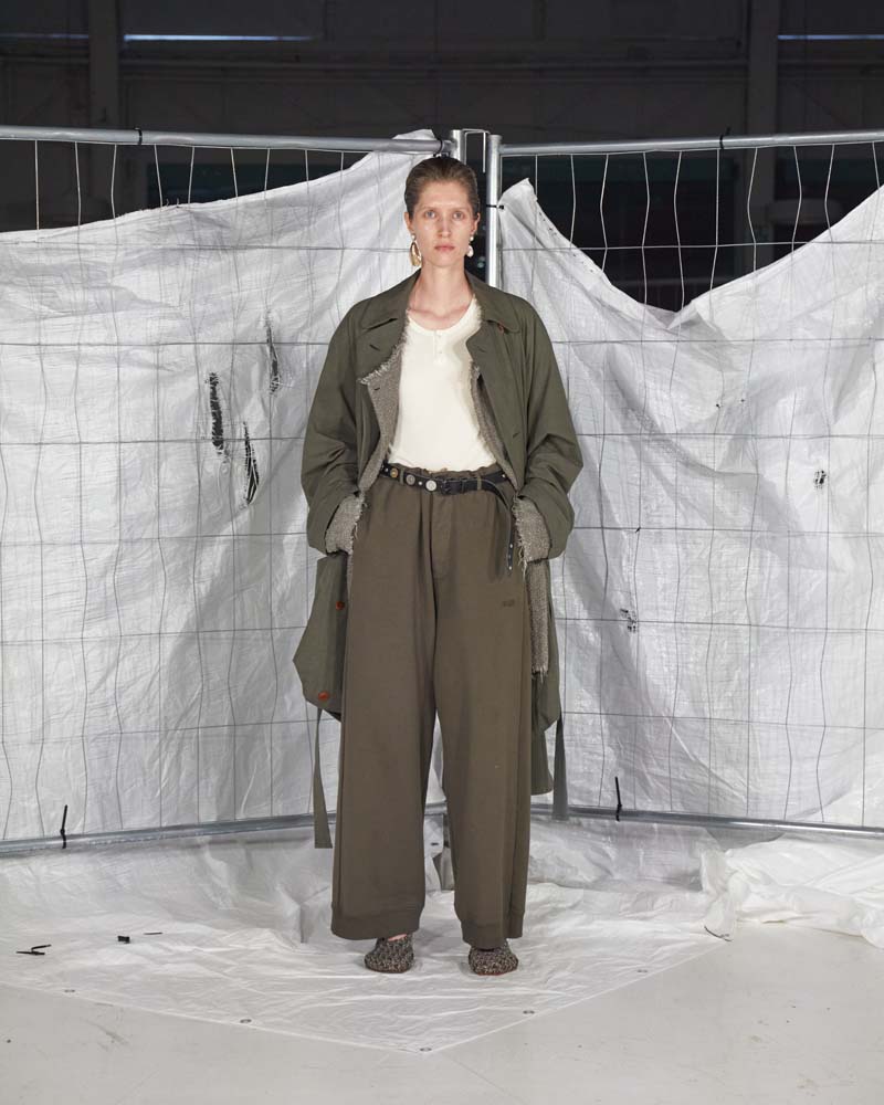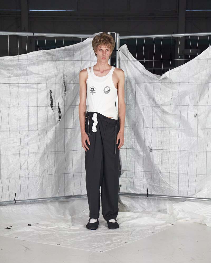 Otro de los puntos fuertes es la sastrería; vista en esta colección como un elemento subversivo que presenta americanas de proporciones experimentales y hombros caídos. La deconstrucción también se hace notar en esta oferta, donde pedazos de la misma tela sirven como elementos de constricción para el cuerpo; por supuesto, los pantalones de pinzas se imaginan a juego con sus complementos superiores, de corte baggy amontonándose sobre el calzado (que bebe inspiración de tendencias dosmileras de calzado).