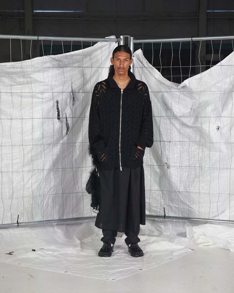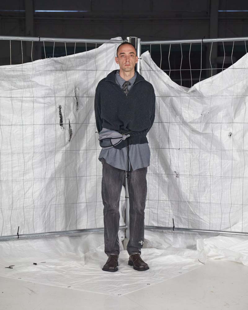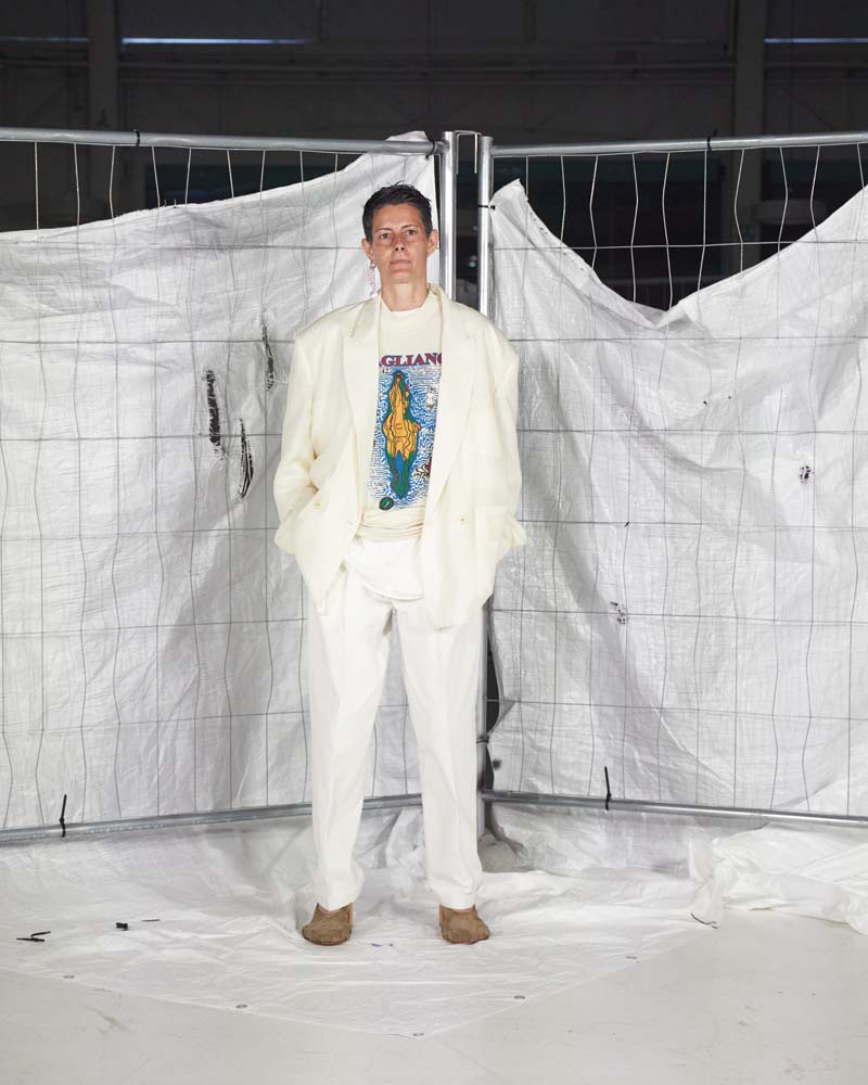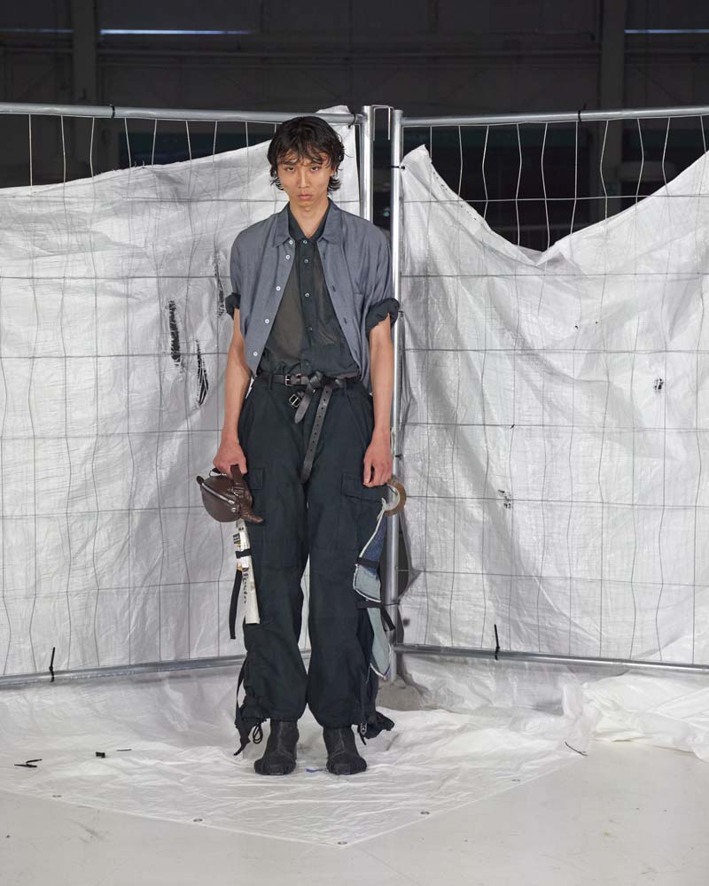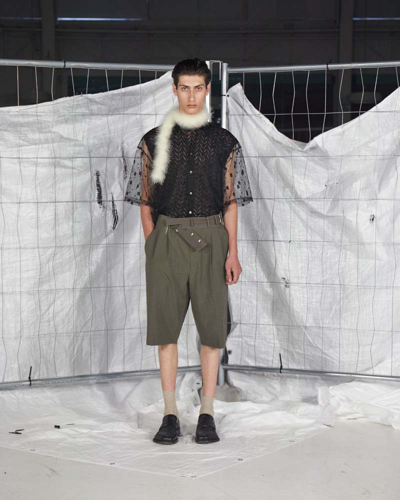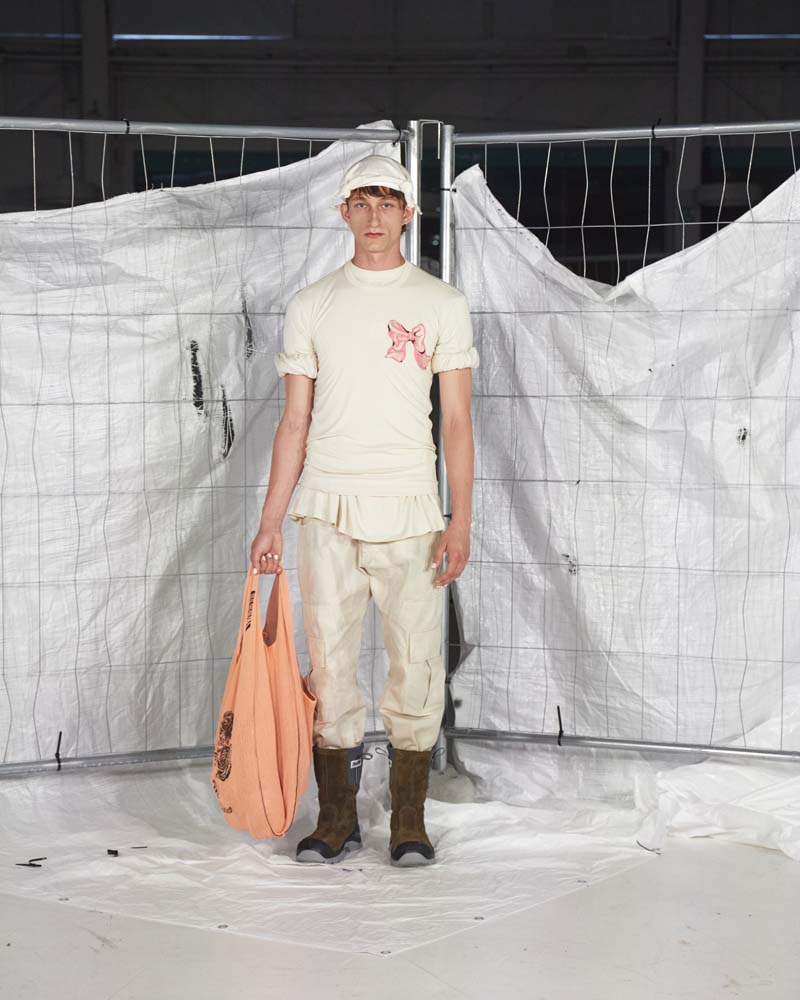 Otro de los puntos fuertes es la sastrería; vista en esta colección como un elemento subversivo que presenta americanas de proporciones experimentales y hombros caídos. La deconstrucción también se hace notar en esta oferta, donde pedazos de la misma tela sirven como elementos de constricción para el cuerpo; por supuesto, los pantalones de pinzas se imaginan a juego con sus complementos superiores, de corte baggy amontonándose sobre el calzado (que bebe inspiración de tendencias dosmileras de calzado).