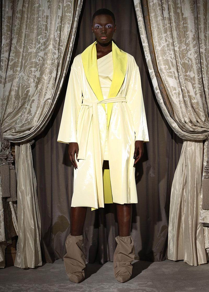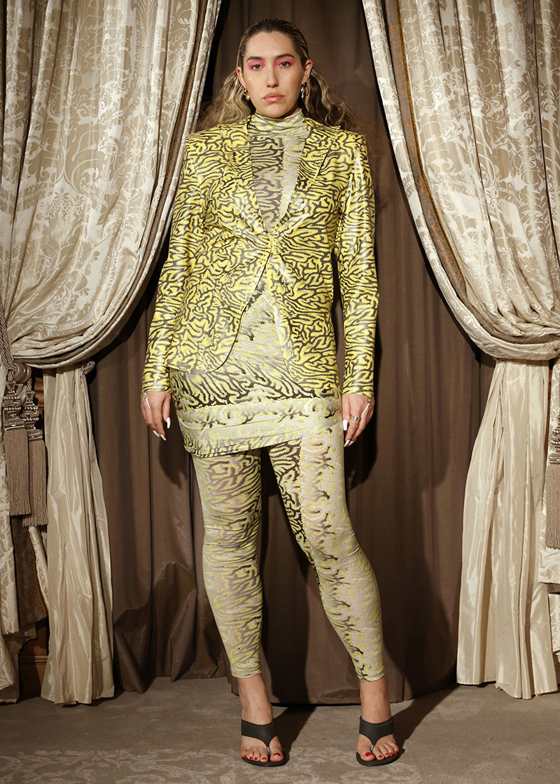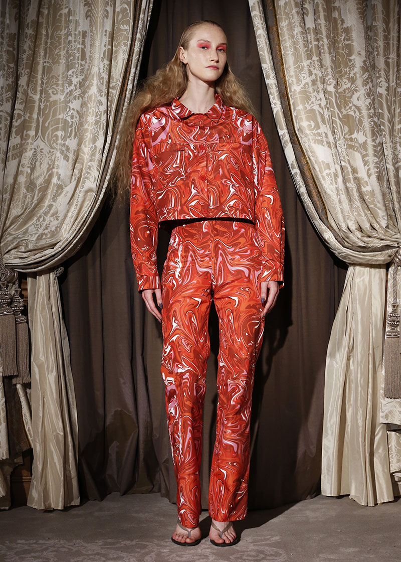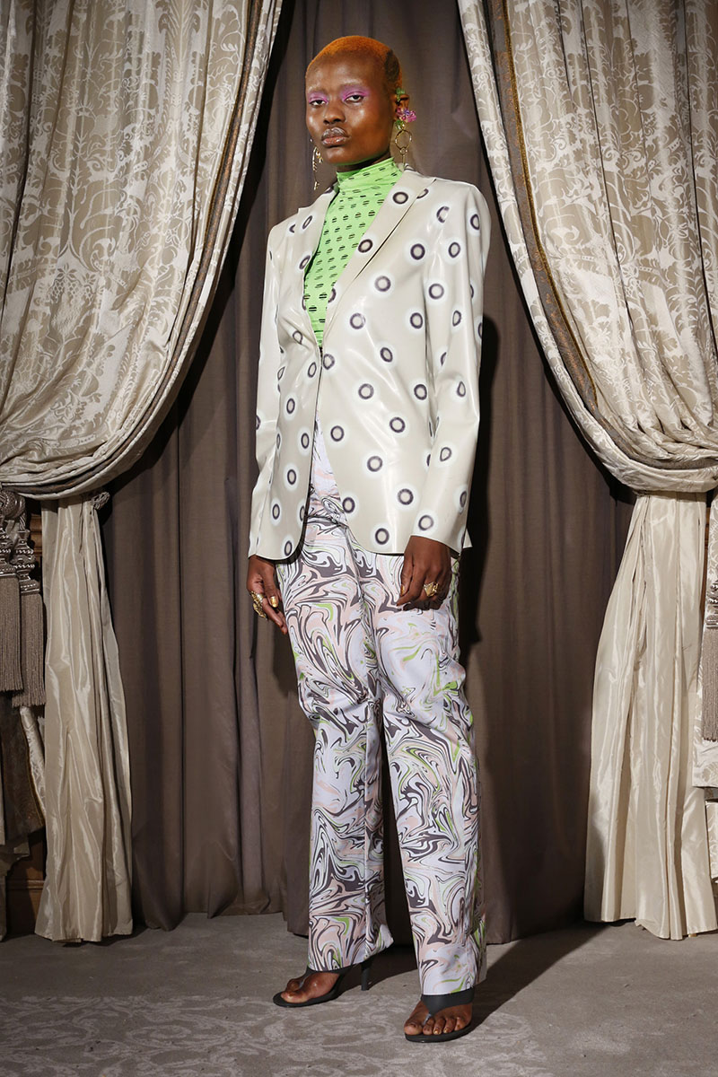 Fundada en 2019, gracias a la beca concedida por Kanye West para jóvenes talentos, la firma ha buscado elaborar en esta colección pre-fall un complejo estudio sobre el cuerpo de la mujer. Para lograrlo, Schloss ha experimentado con los tejidos como la lycra o el nylon. Aunque los verdaderos protagonistas han sido los estampados que la propia diseñadora ha creado durante horas frente a la pantalla de su ordenador. Ésta vez se ha inspirado tanto en los veteados del lujoso mármol como en las divertidas lámparas de lava logrando combinaciones únicas y apetecibles.