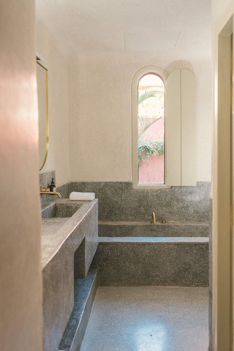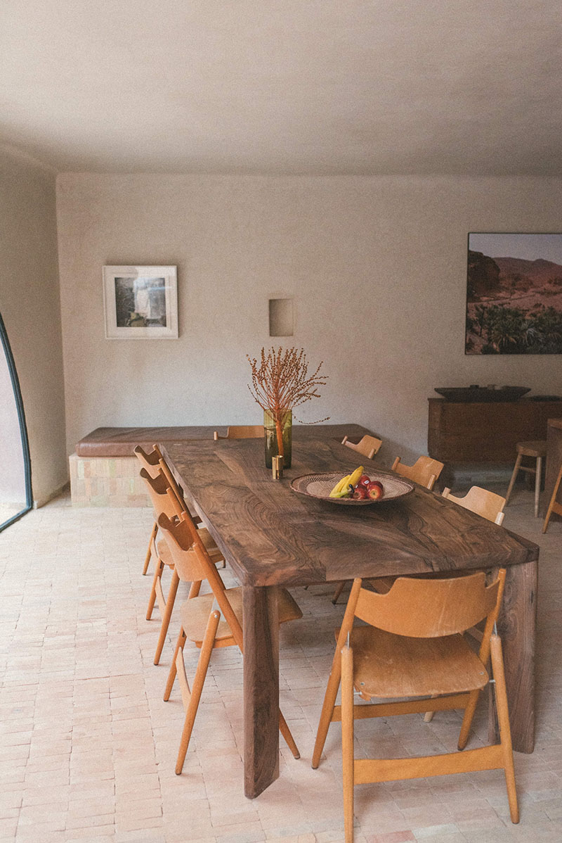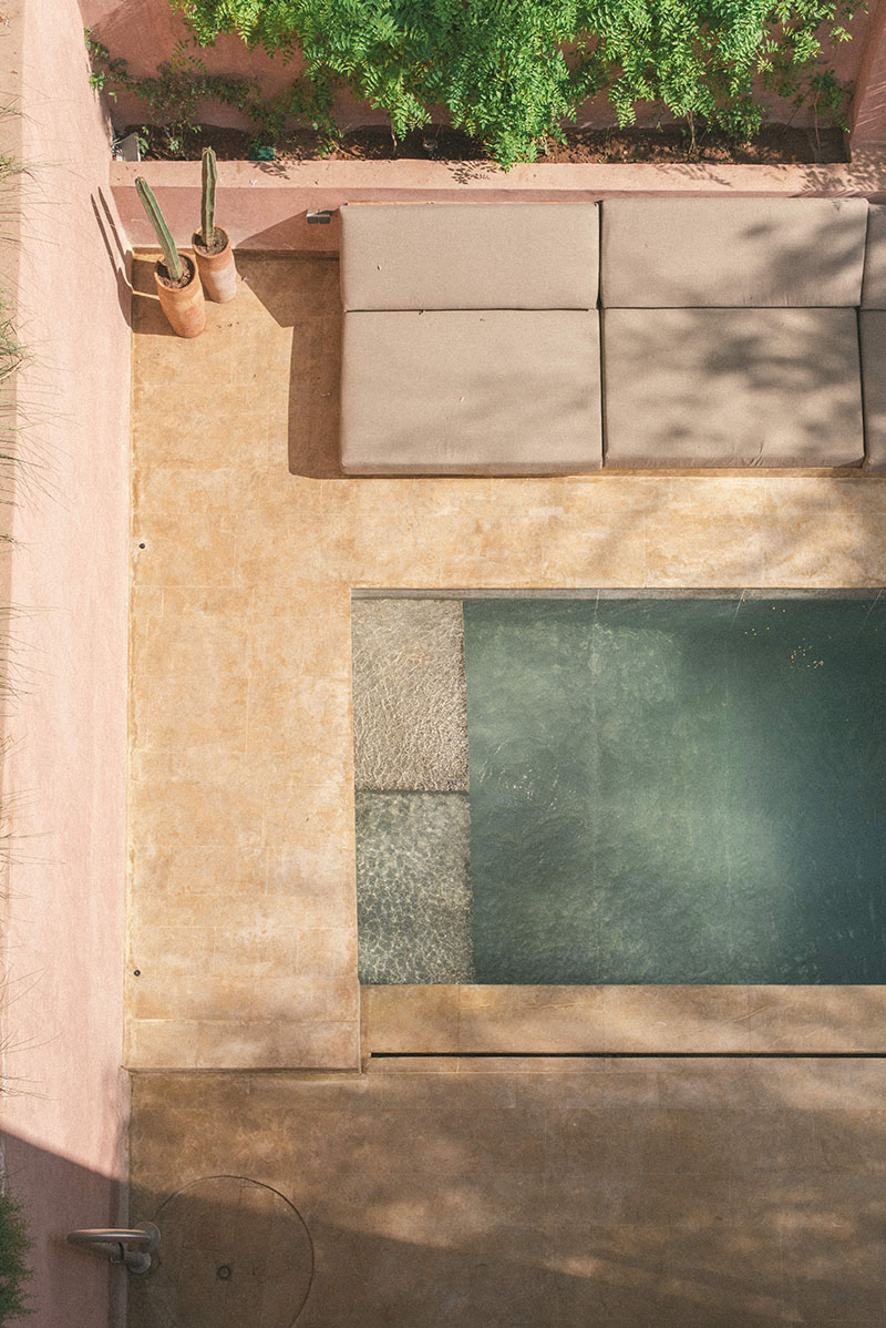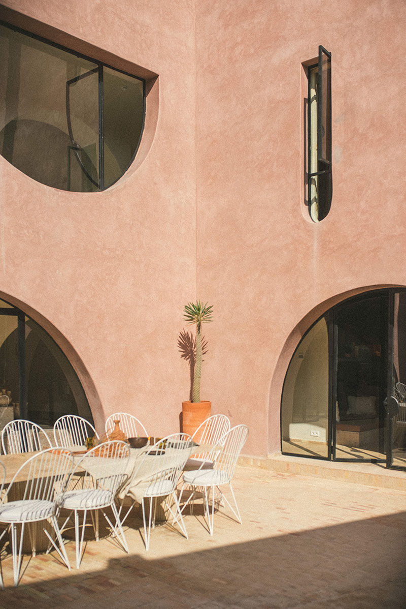 Su interiorismo mezcla acabados hechos a mano con diseños clásicos, piezas artesanales y obras de arte contemporáneas. La estética moderna se complementa con clásicos del diseño como las sillas de Egon Eierman o la mítica lámpara de papel de Ingo Maurer. Los suelos de terrazo fabricados in situ se combinan a la perfección con el famoso material tradicional marroquí tadelakt. Todas las habitaciones están equipadas con muebles de madera y latón hechos a mano por el fabricante local de alta gama Maison Nicole, lámparas de suspensión de los italianos Vesoi, todos los grifos de la marca italiana Neve y tiradores de puerta Lama de Gio Ponti.