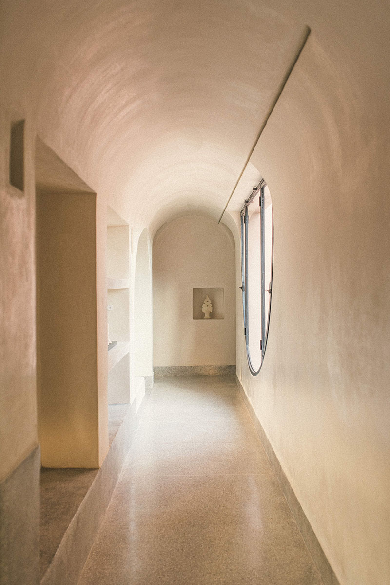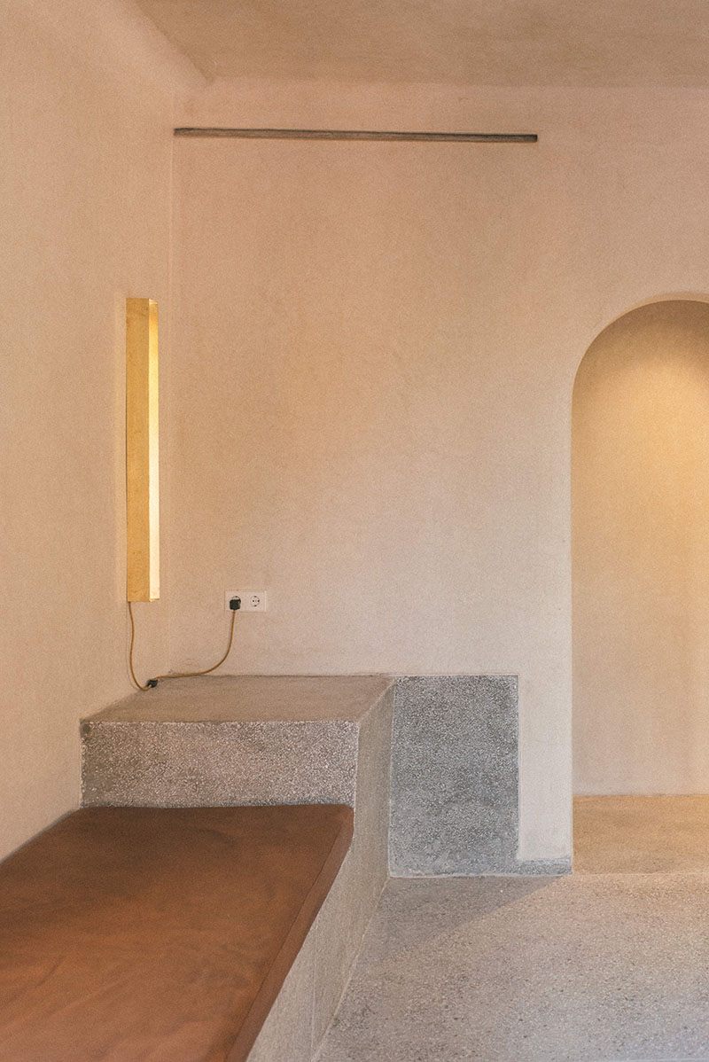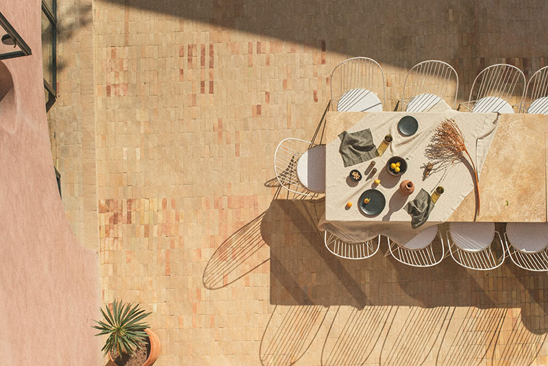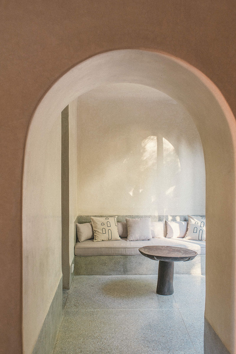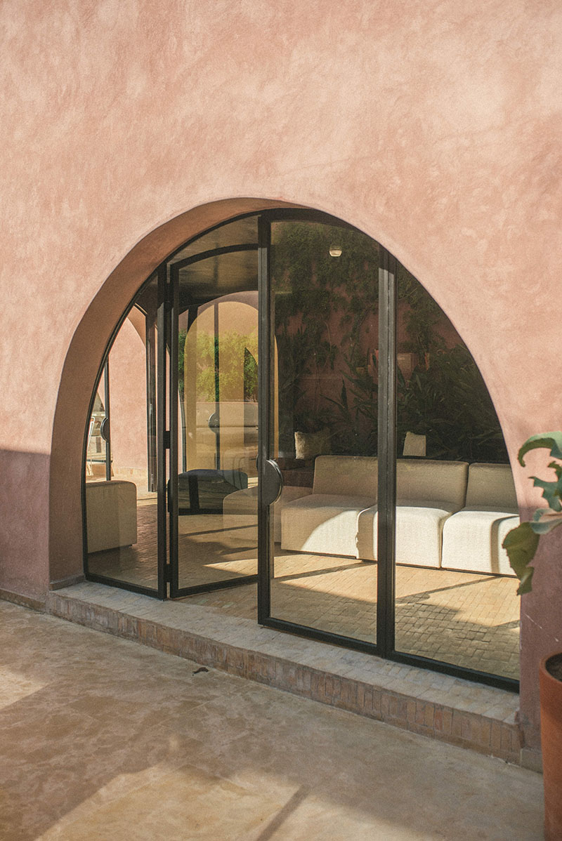 Su interiorismo mezcla acabados hechos a mano con diseños clásicos, piezas artesanales y obras de arte contemporáneas. La estética moderna se complementa con clásicos del diseño como las sillas de Egon Eierman o la mítica lámpara de papel de Ingo Maurer. Los suelos de terrazo fabricados in situ se combinan a la perfección con el famoso material tradicional marroquí tadelakt. Todas las habitaciones están equipadas con muebles de madera y latón hechos a mano por el fabricante local de alta gama Maison Nicole, lámparas de suspensión de los italianos Vesoi, todos los grifos de la marca italiana Neve y tiradores de puerta Lama de Gio Ponti.