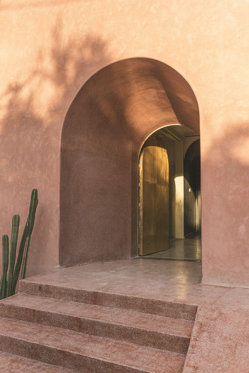 Imagen superior: Puerta de acceso al hotel de latón pulido, con escaleras de terrazo y fachada de tadelakt.