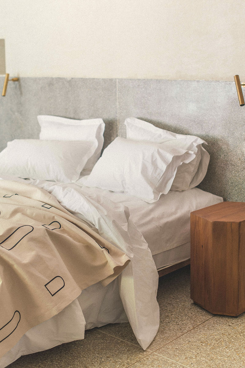 Las camas están vestidas con sábanas de algodón orgánico sin blanquear, y la colección imagina cubrecamas y fundas de almohada bordadas con motivos arquitectónicos en diálogo con la arquitectura que habitan. Cada pieza ha sido elaborada localmente en Barcelona siguiendo nuestros más altos estándares de calidad, con materiales orgánicos y naturales. La colección es exclusiva de Maison Brummell Majorelle en Marrakech y no está disponible para su compra.