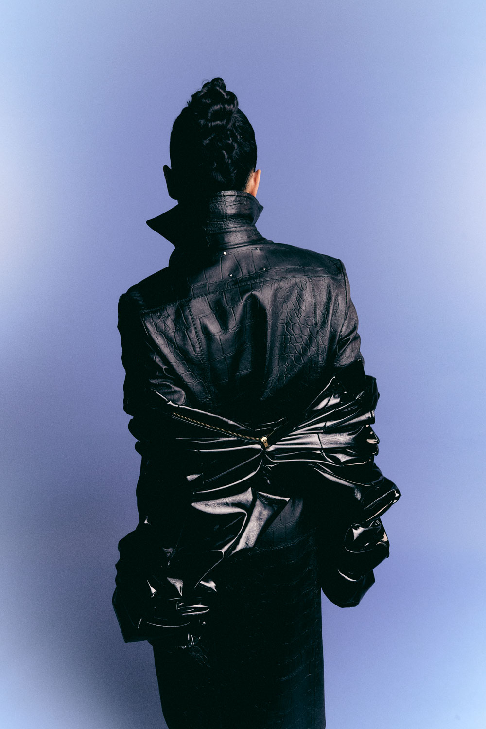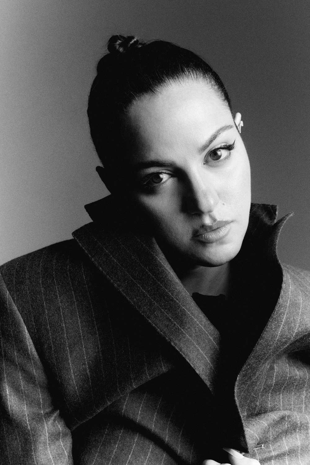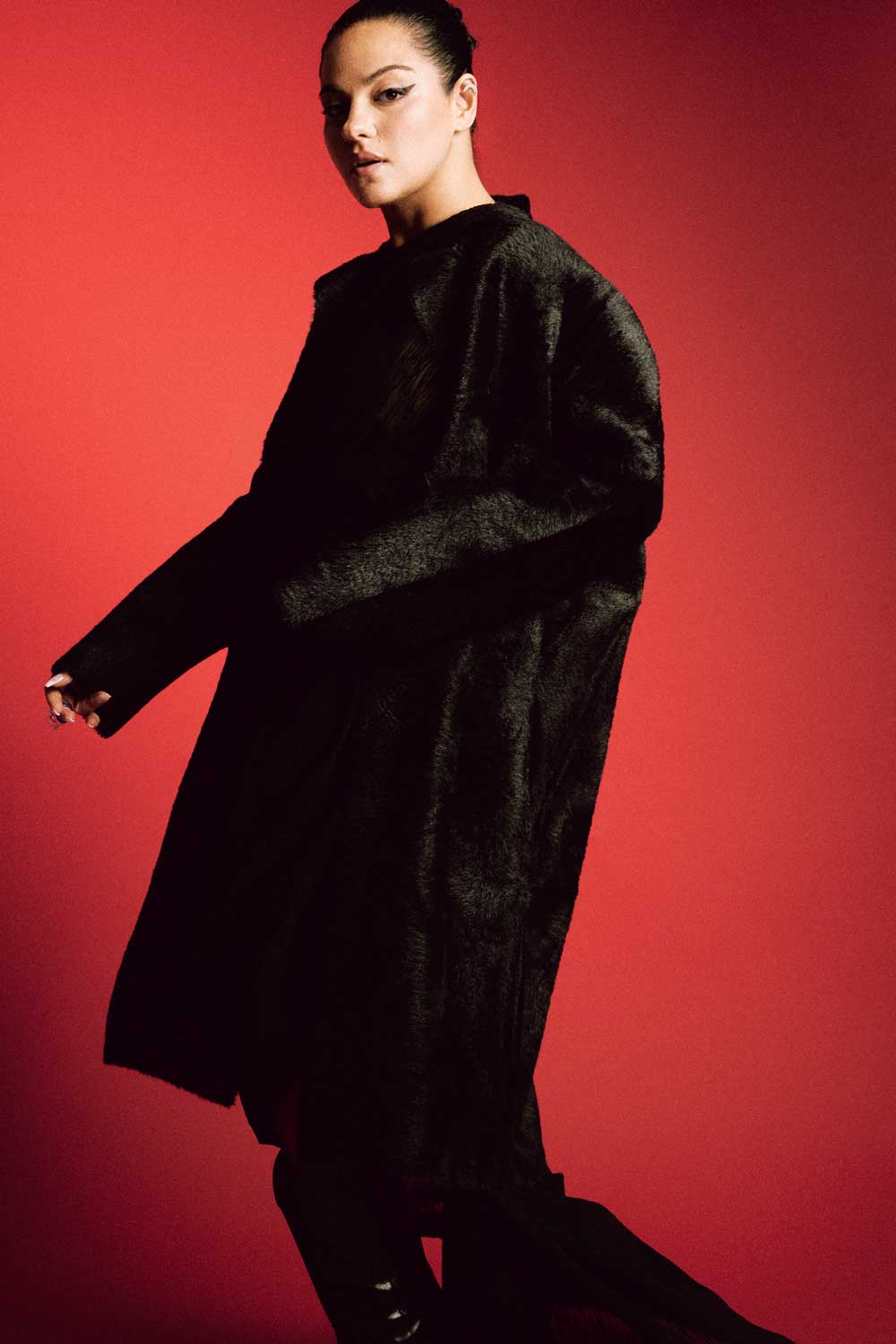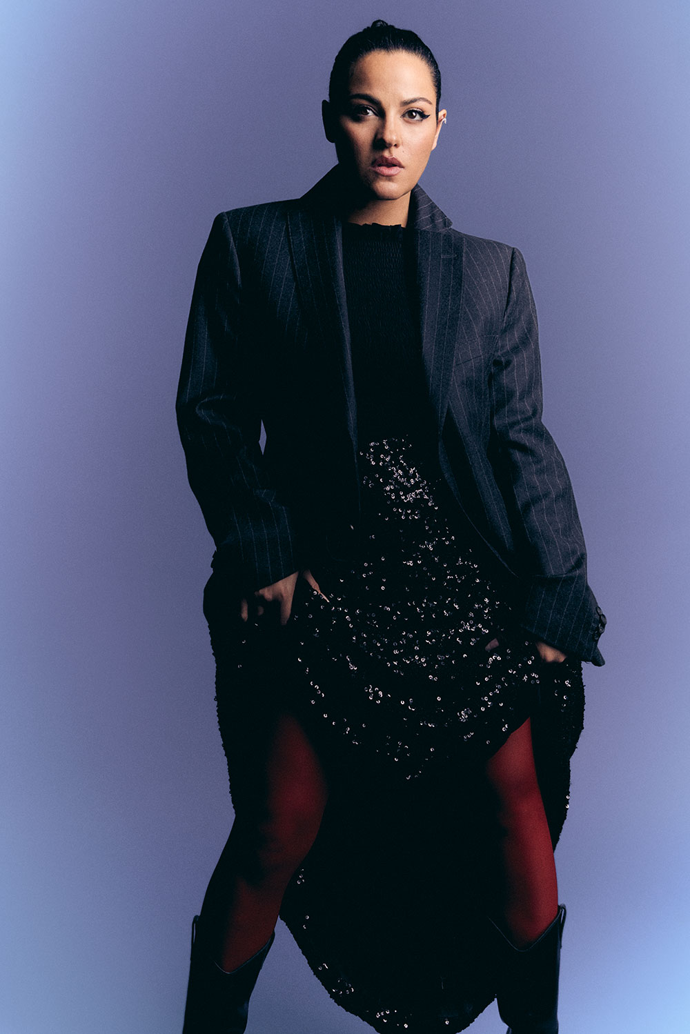 La actriz y cantante mexicana con traje LE PETITE MORT más abrigo y botas HUGO
