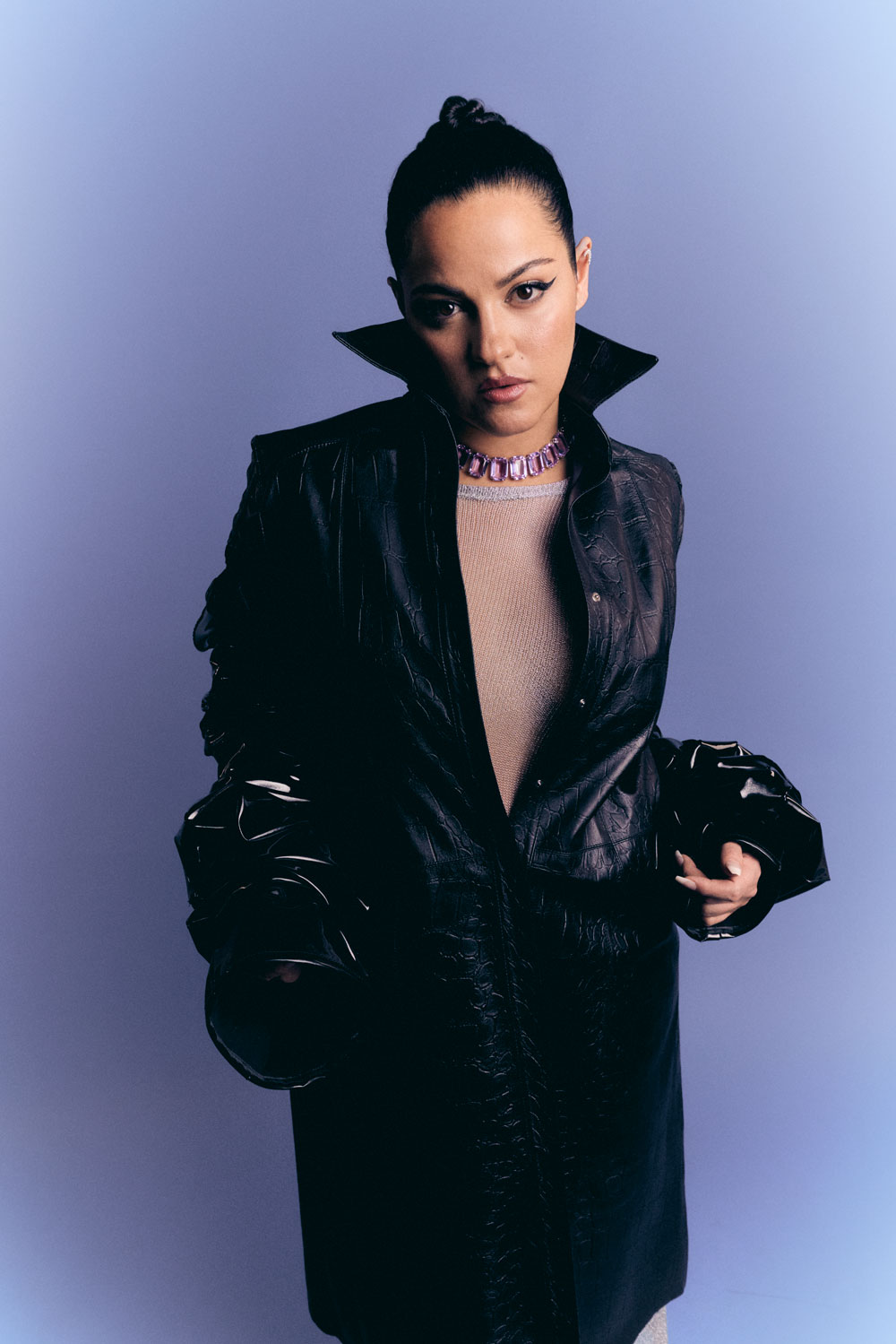 Maite Perroni con gabardina ATRIO, pantalón a modo de mangas ALFRED MARTINEZ, blusa AYANEGUI y collar SWAROVSKI
