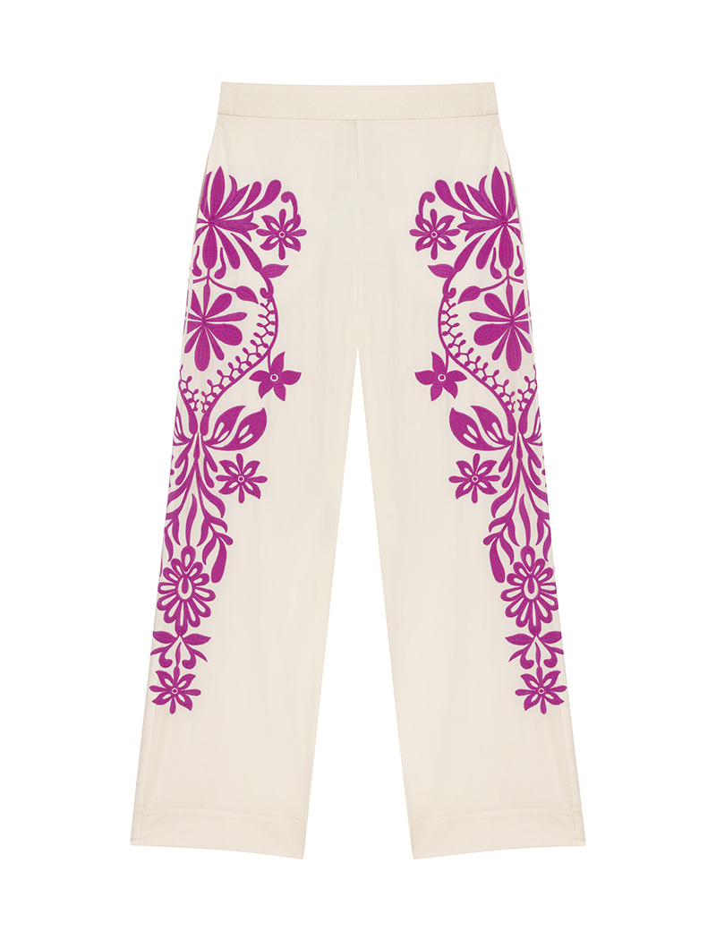 Pantalón bordado en morado de la colección “Tropical Purple”