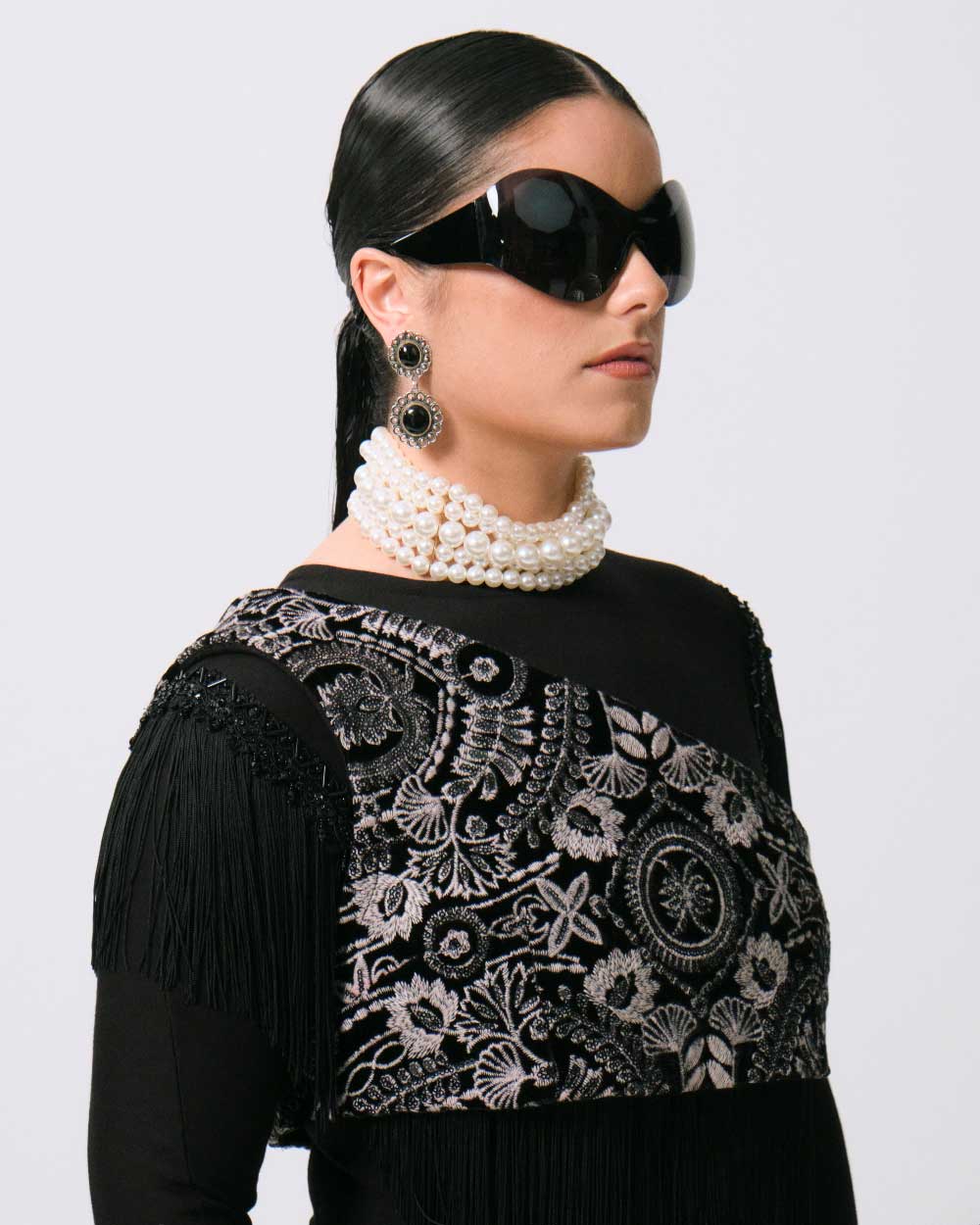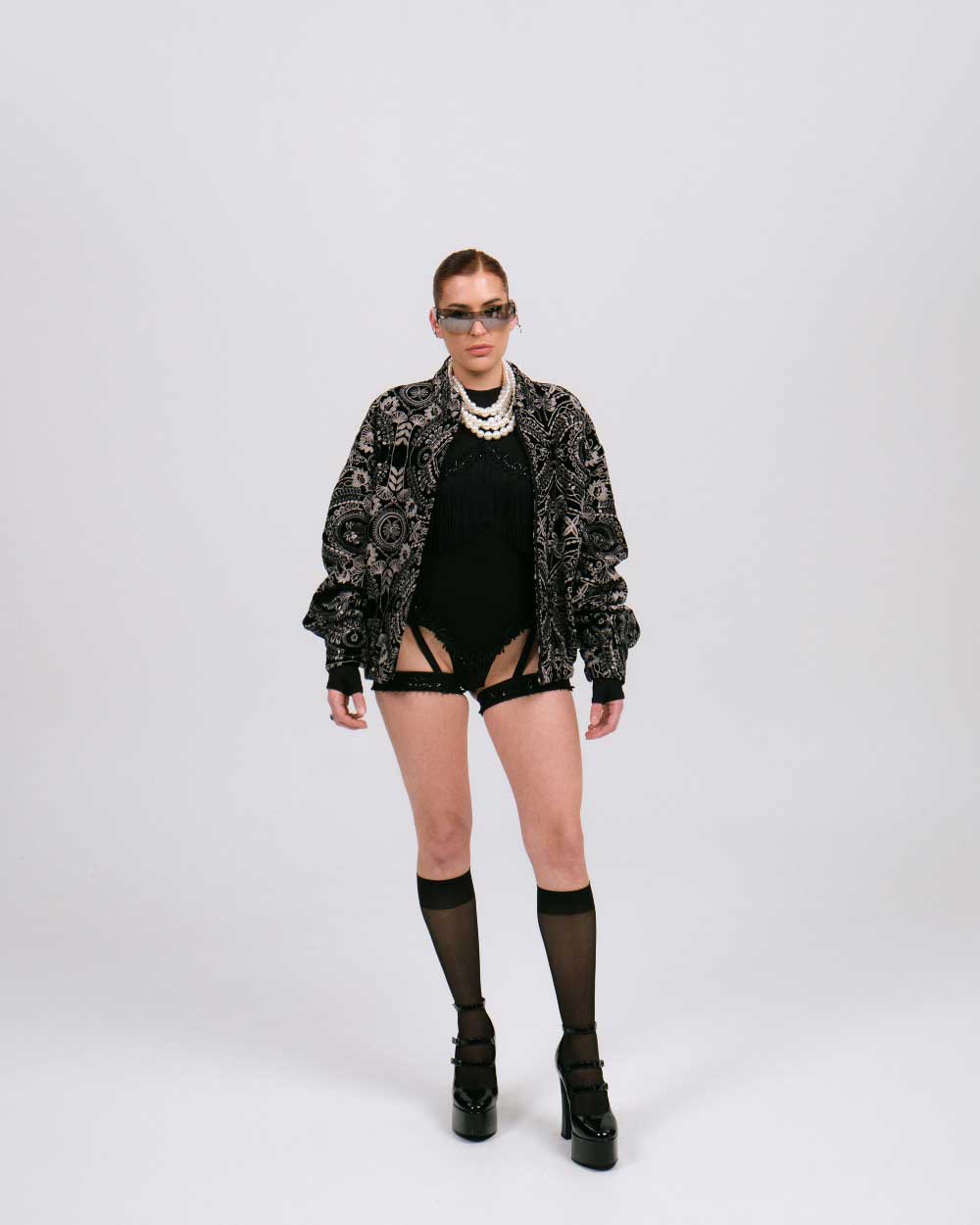 La música tradicional gallega, y en especial su música, siempre me ha transmitido un aura mística muy poderosa, por lo que decidí empaparme de su música y dejarme llevar. En este vestuario utilicé la impresión digital sobre textil, estampando sobre las prendas una versión del archiconocido aquelarre de Goya. Por último, para el tercer vestuario optamos por hacer una reinterpretación contemporánea de la vestimenta tradicional gallega, adoptando algunos de sus elementos como la pasamanería o los bordados tradicionales y traduciéndolos al lenguaje actual, apostando todo a su color fetiche, el negro, y cosiendo a mano la pedrería de los trajes.