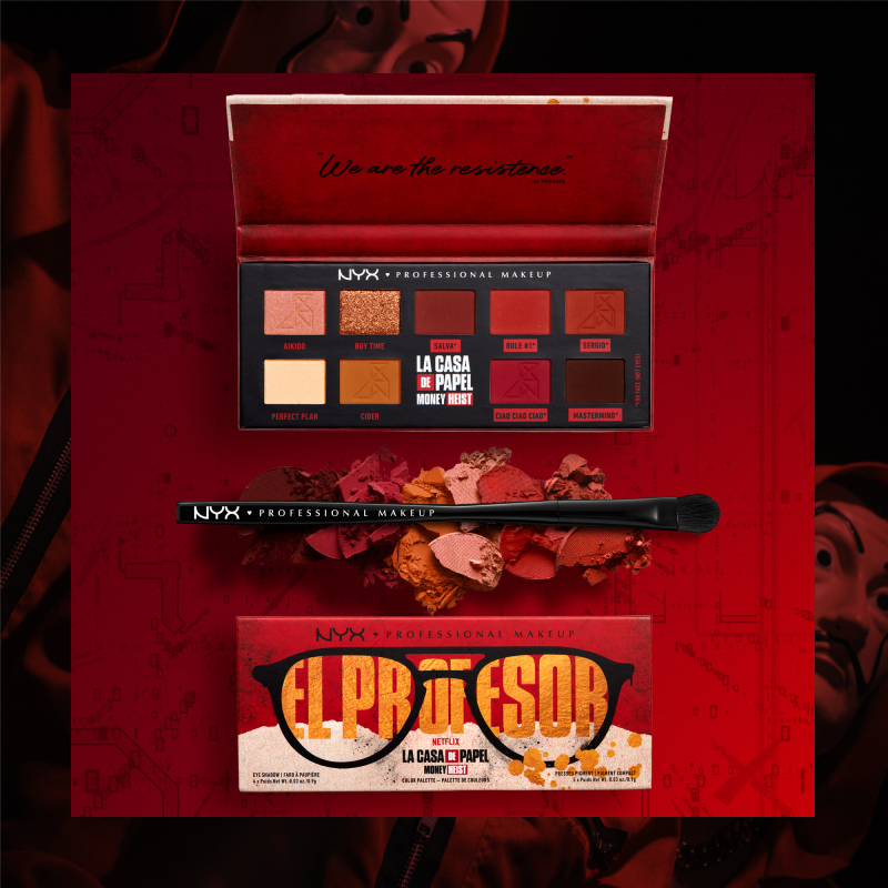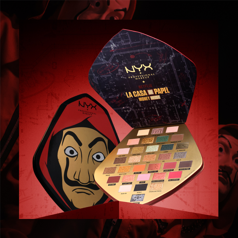 NYX Professional Makeup presenta una colección inspirada en el fenómeno internacional de La Casa de Papel. Siendo esta la tercera colaboración de la franquicia con Netflix, la colección incluye dos paletas de sombras, pintalabios, un Epic Ink Liner, iluminadores y un espejo con la forma de la máscara de Dalí. La muestra pretende dar vida a la serie a través del maquillaje, adornando sus productos de infinidad de referencias al universo de LCDP.