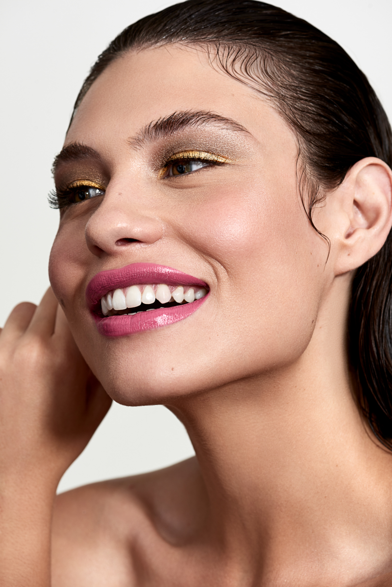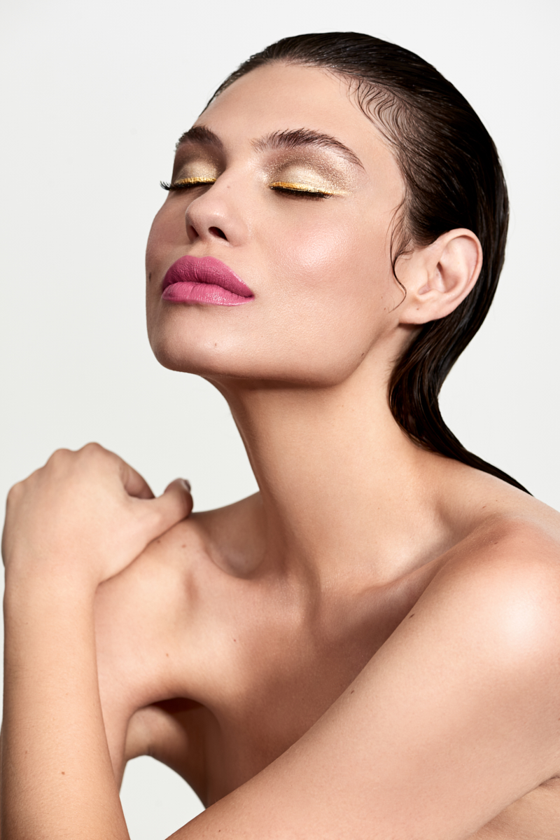 Apostamos por una piel muy fresca, con una base de maquillaje muy ligera. En los ojos usamos una sombra en un color marrón satinado para dar profundidad a la mirada y un eyeliner dorado. Para acentuar terminamos con mascara de pestañas. Para la boca un labial hidratante en color rosa. En los pómulos un toque sutil de colorete en crema.