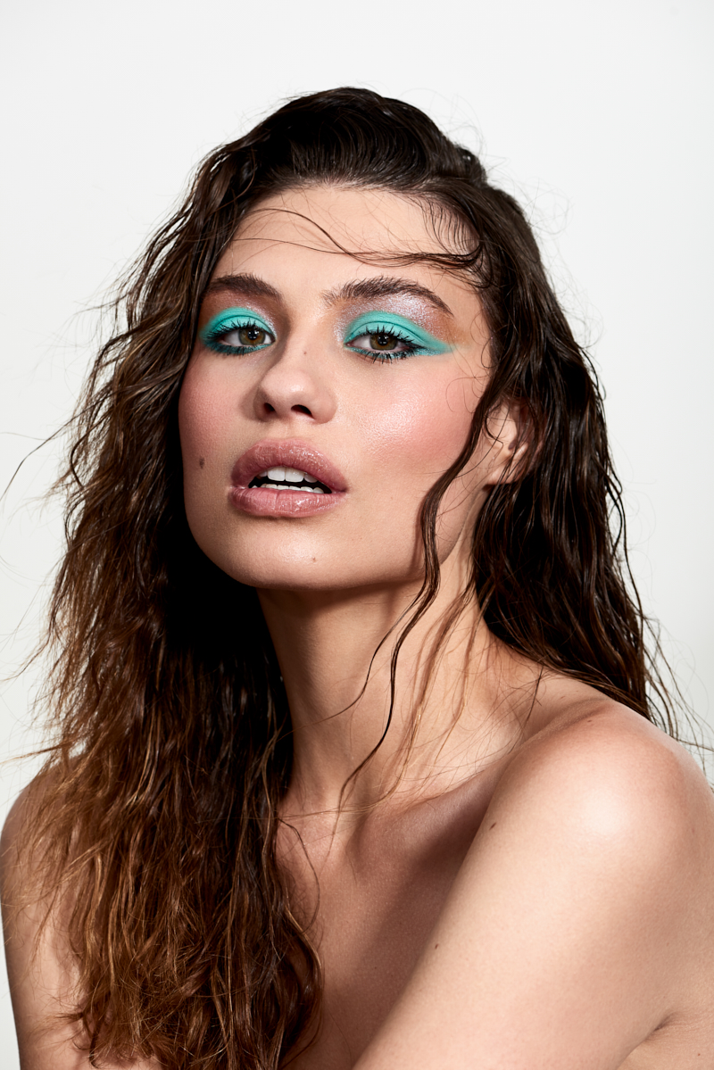 Creamos un maquillaje de verano para un momento más especial. Utilizaremos una sombra azul celeste por todo el párpado superior uniendo con una sombra nacarada para aportar luz hasta legar a las cejas . En la parte inferior utilizaremos un lapiz del mismo color por debajo de las pestañas. También aplicaremos mucha máscara de pestañas arriba y abajo. Un toque más sutil en los labios con un gloss en tono metalizado y polvos de sol para subir el bronceado.