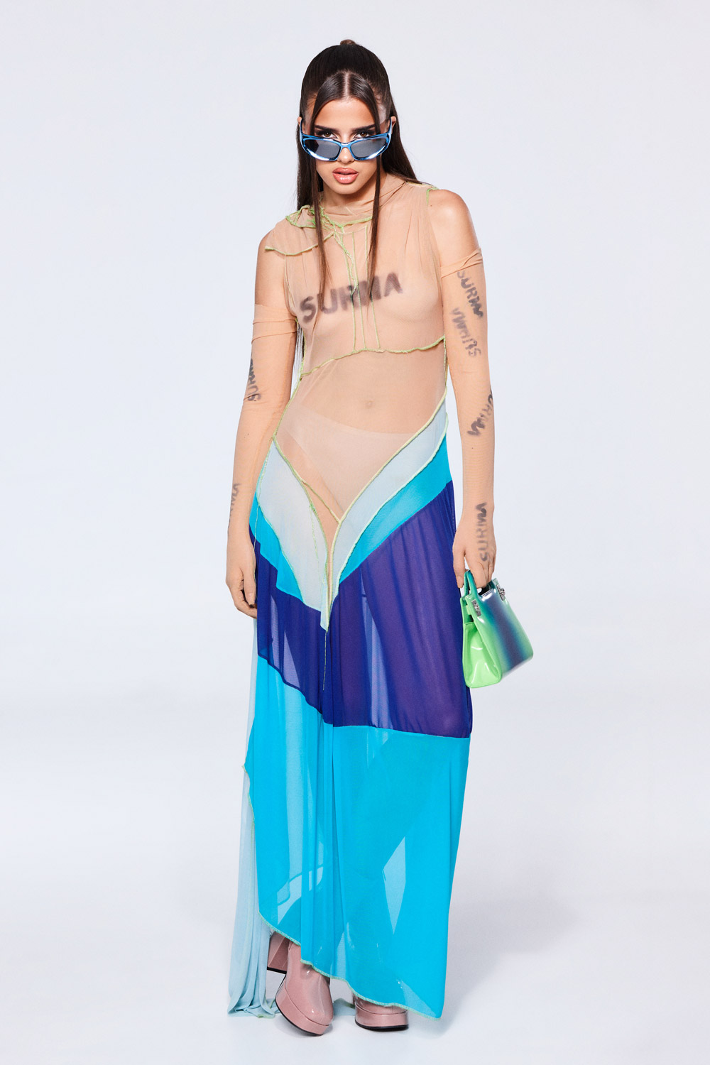 Mar Lucas con vestido de transparencias con guantes SURMA + Bolso FERRAGAMO + Botines XTI fabricados en charol con cremallera lateral y tacón ancho de 10 cm con plataforma delantera de 3 cm. Este modelo ha obtenido el certificado vegano por la organización mundial PETA (organización de los derechos de los animales) + Gafas PULL & BEAR