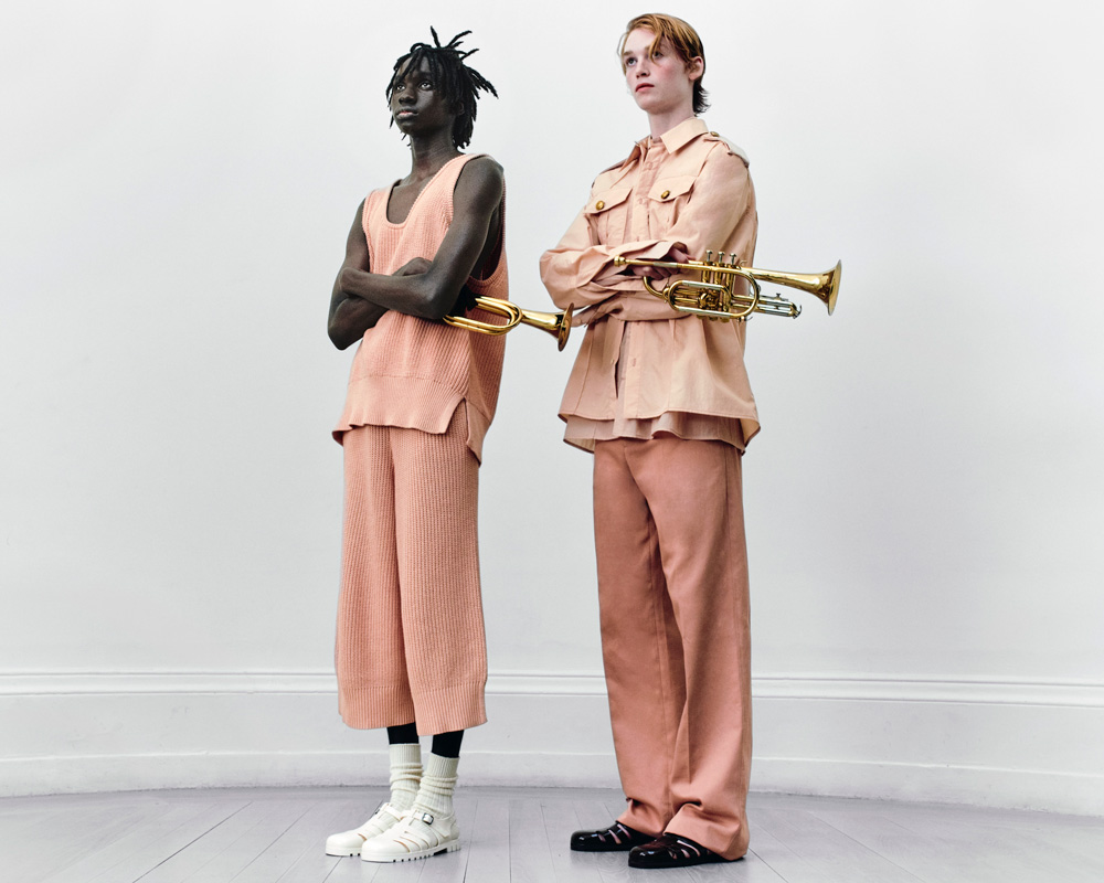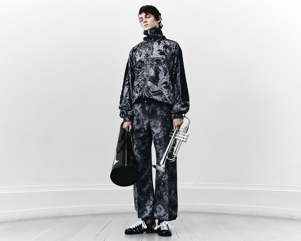 En cuanto al traje más clásico, Denzilpatrick explora un poco de nostalgia y utilidad con un conjunto acentuado por bolsillos militares, a juego con una field jacket. Otro punto clave del tema leisure de la colección viene de las orquestas. Aquí, la indumentaria de estos uniformes se usa para crear estampados trompe l’oeil integrales en camisetas o tops. E incluso, las borlas y ornamentaciones de este armario se usan para elevar camisetas básicas.