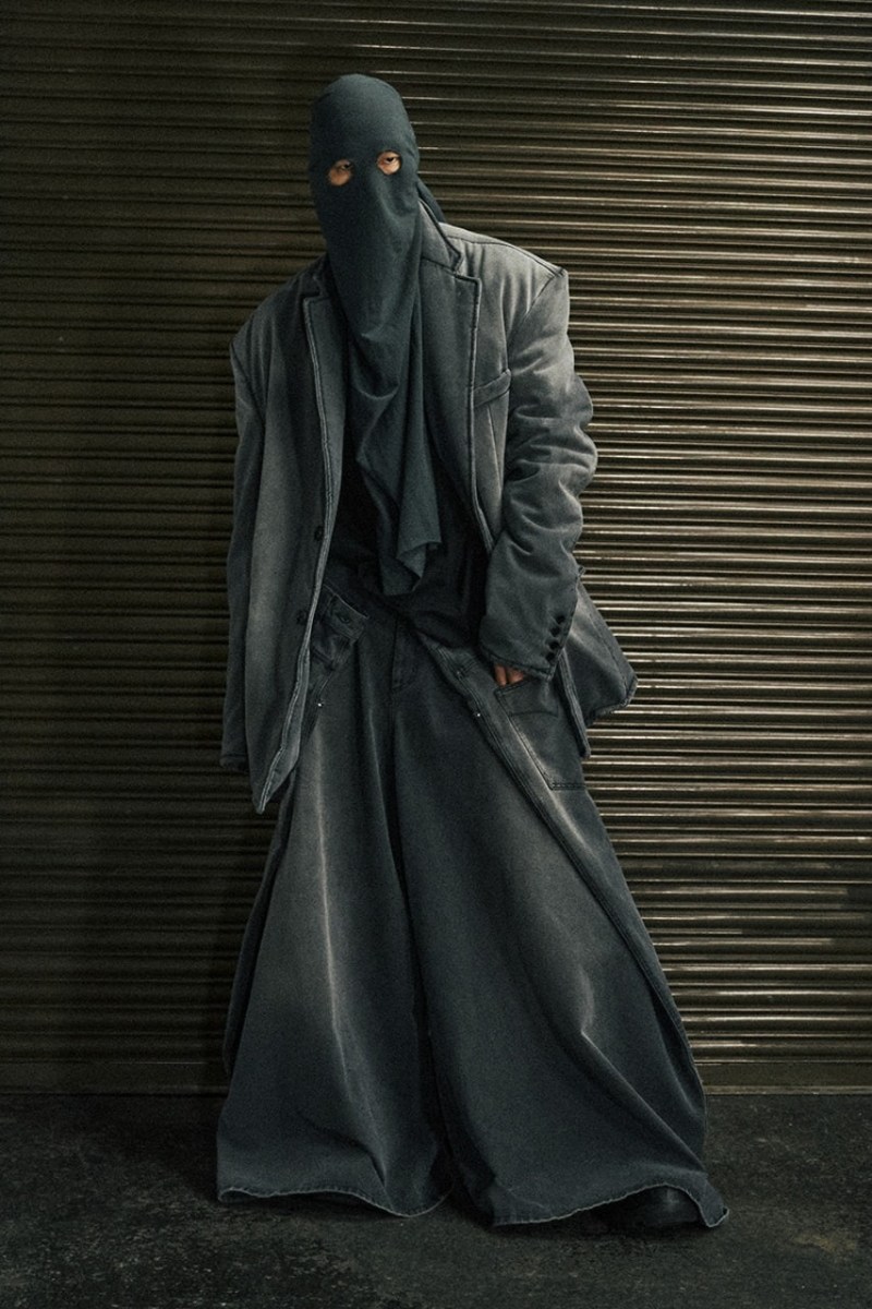 A juego con esto, LUU DAN FW25 también explora el denim como la base fundamental de cualquier armario de inmigrante. Aquí, salen a relucir estas mismas siluetas escultóricas y gigantes con tela vaquera lavada en negro. Como podréis imaginar, los jeans y jorts son exageradísimos, y se complementan de sudaderas, prendas de punto y blazers de proporciones similares. Y, como theme recurrente, encontramos camisetas anudadas como pasamontañas, que dan un aire más agresivo y amenazante al repertorio de looks.