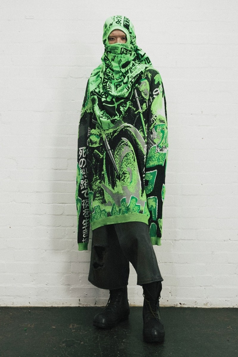 Otra pieza clave dentro del repertorio de Luu Dan FW25 es su jersey oversize, hecho con un jacquard gráfico con motivos Y2K en verde flúor. El cuero también es otro tema recurrente, y se deja ver en cazadoras cropped y oversize, mandiles con hardware, faldas con subcapa quilted, chaparreras gigantes y guantes.