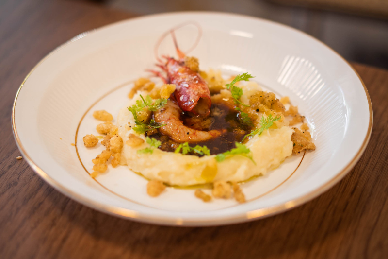 Skordalia, un puré de patata, pan, ajo y vinagre con ‘suquet’ de gambas.