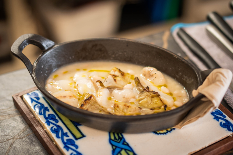 Sin embargo, los fines de semana, en las sugerencias (siempre hay, pregunta por ellas) se propone pan de pita con diversas versiones y rellenos. Uno de ellos es el de gallo negro y graviera (un queso azul griego) con huevo poché. Aun así, tienen platos que son dignos rivales, como la skordalia, un puré de patata, pan, ajo y vinagre que en Grecia se sirve con bacalao en tempura. En la Barcelona de Jordi, se prepara con un ‘suquet’ con gambas que sitúa al comensal en esta tierra.