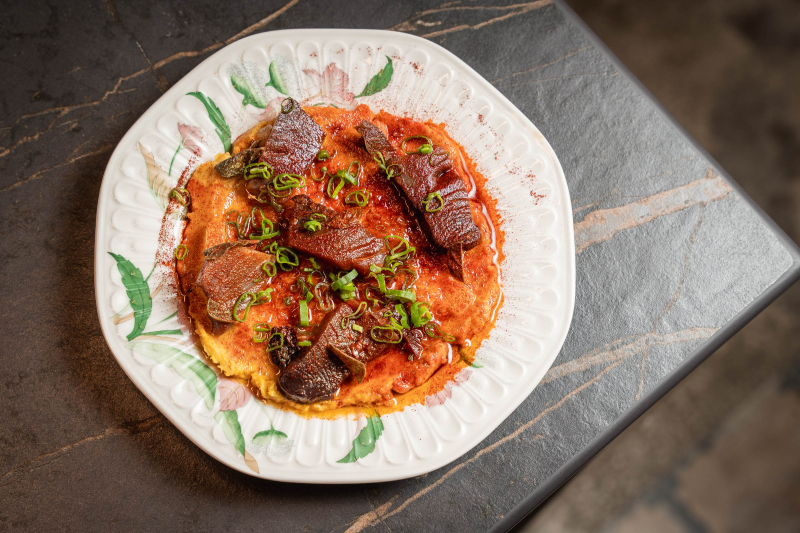 El taramas es un entrante que en Grecia se realiza con huevos de pescado en salmuera. Otros ingredientes son miga de pan, zumo de limón, de cebolla o aceite de oliva. En Barcelona, este plato típico se transforma en una sagaz versión de la brandada de bacalao en sabor y en textura, incorporando la remolacha y la algarroba a la ecuación.