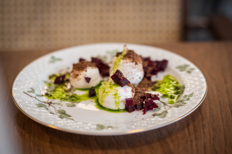 De la mano de Andrea en sala se empieza conociendo sus platos y vinos. Seguramente surgirán muchas dudas, nombres que no se conocen, ingredientes diferentes, vinos singulares. Pero ella está ahí para guiar al comensal. Su carta, algo enigmática, divide los platos en sus tres o cuatro ingredientes principales. Así se pueden encontrar, por ejemplo, entrantes como taramas / remolacha / algarroba, sin duda uno de los hits de este restaurante de Barcelona.