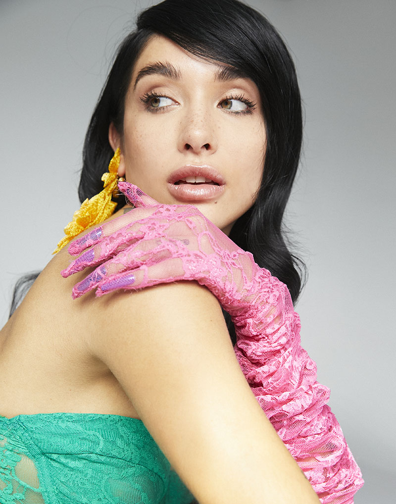 María Becerra lleva top y guantes de encaje GEORGIELA STUDIO + Pendientes Azucena amarillos VERBENA MADRID / Cabello con I.C.O.N. PRODUCTS: Texturiz + Mesh + Whip