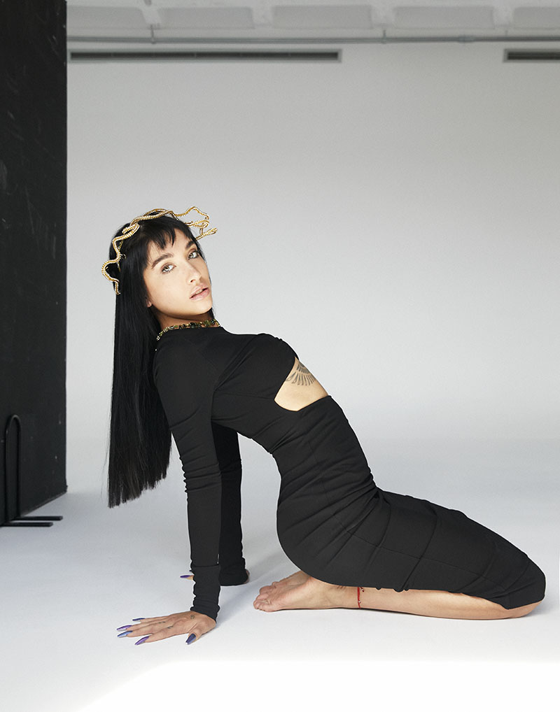 María Becerra lleva vestido cut-out DSQUARED2 + Diadema BETTOGARCIA + Collar Gema SWAROVSKI / Cabello con I.C.O.N. PRODUCTS: OG Foam + Whip + Airshine + Done