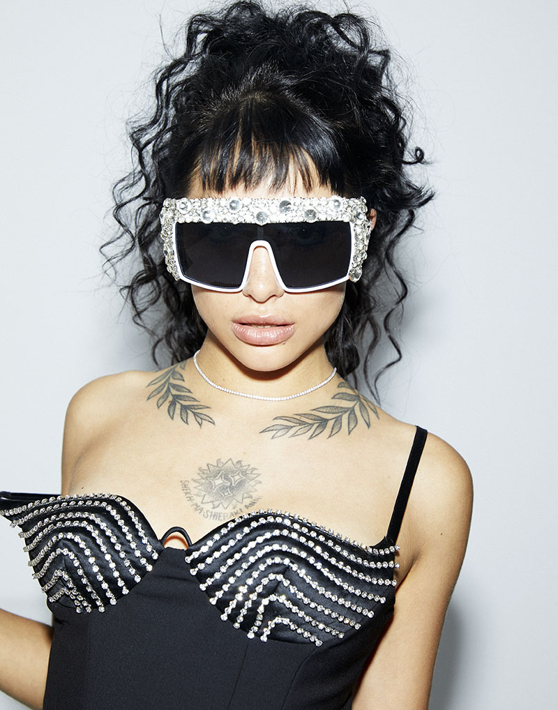 María Becerra lleva vestido con cristales AREA x WOW CONCEPT + Gafas de sol con cristales FATTYGLASSY + Gargantilla Grace plata y pendientes trepadores Starfield plata BAROKAH JEWELS / Cabello con I.C.O.N. PRODUCTS: Allow + Putty