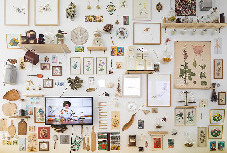 Marisa Benjamin: La idea es invitar a personas a entrar en un lugar de memoria y de retorno a la naturaleza. “Benjamim’s Kitchen” es una reinvención del espacio de la cocina, un laboratorio arqueológico del sabor, una nueva visión en torno a las flores como figuras arquetípicas de belleza y transitoriedad en nuestra cultura. Es una instalación multidisciplinar compuesta por dibujos, vídeos, fotografías, plantas y objetos que están relacionados con las flores y con la memoria emocional de muchas cocinas y jardines que he rescatado principalmente de mercadillos de segunda mano.