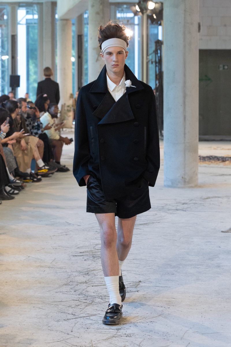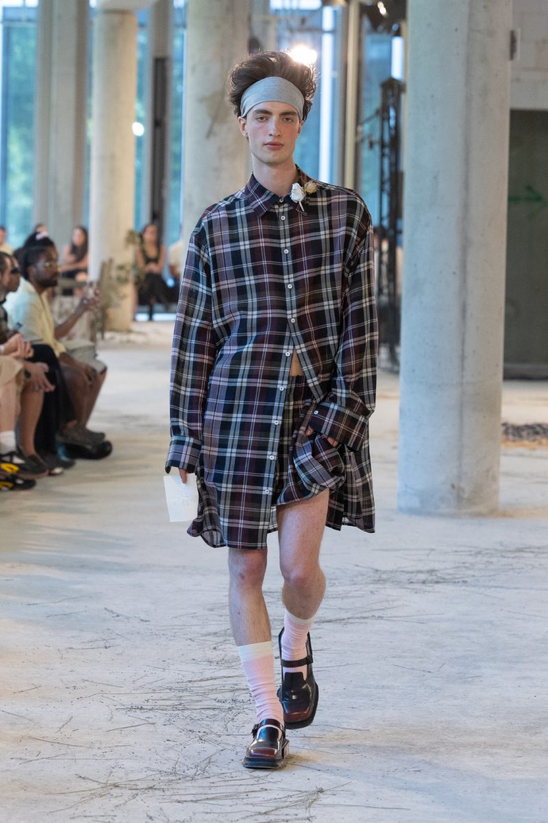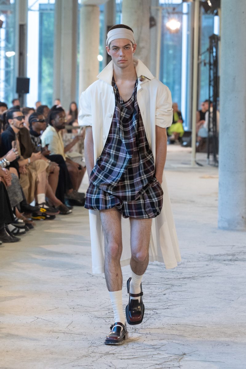 En el medio de Marke ss26 está The Light, la fase de aceptación. Aquí, el armario menswear se relaja con staples más casuales y se empieza a ver un poco de feminización en los looks. Por ejemplo, una sudadera deportiva y oversize se conjunta con un short abullonado; los tops de manga corta dejan ver más piel, los cuellos rebosan de tela, ahora las líneas sartoriales son llevadas. Entre medias, se juega con el tartán en looks con siluetas más experimentales; la paleta de colores se aclara.