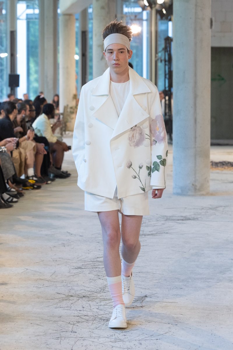 Y luego, pasamos a ese sentimiento de añoranza con The Memory. Esta parte de Marke ss26 combina los arquetipos de las dos partes anteriores, pero ahora en blanco nuclear. Esto abre con una americana cruzada sin mangas y un pantalón ultra baggy. A medida que va evolucionando, salen a relucir estampados florales y muy delicados que contrastan con la rigidez del tailoring que permiten ver el pasado con ojos más permisivos; como si se quisiera recordar un verano que no pasó así.