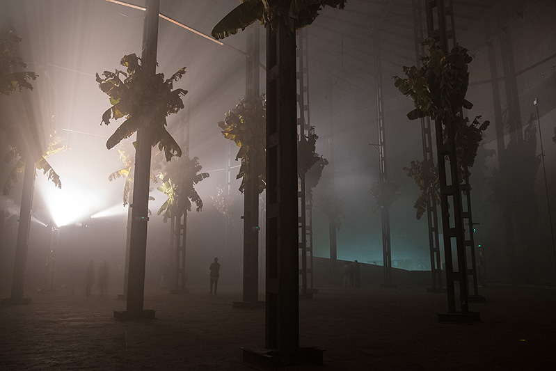 M. de A.: Pues este proyecto es también muy especial para mí. Lo realicé gracias a la invitación de la comisaria Dalia de la Rosa para pensar y activar este espacio tan curioso. La verdad es que es imposible generar mediante fotografías, videos o relatos una idea de todo lo que allí pasaba a nivel físico. Quizás sea de mis eventos más sensoriales. La importancia de la presencia era tanta que lo llamamos Cuerpo Presente.Lo que hicimos fue encajar 1600 enormes hojas de platanero entre las columnas del espacio y llenarlo de niebla artificial. Estuve toda la inauguración —unas 4 horas— caminando por la sala sin hablar con nadie, generando sonidos a través del impacto de una barra de metal con las paredes y suelos, que reverberaban varios segundos antes de desaparecer. Esa pérdida de referencia espacial —se entraba dentro pero parecía que salias al exterior—, se mezclaba con una sensación de futuro post apocalíptico, construyendo un paisaje enigmático donde el cuerpo absorbía sensaciones difíciles de clasificar. Ciertamente la obra tiene amplias capas de lectura, entre ellas la idea de agricultura impuesta, como es el caso de los plátanos en Canarias, que ni son propios del lugar, ni tendrían viabilidad económica o cultural, ya que hasta la tierra donde se cultivan viene de fuera. Por eso, el primer impulso que llevó a la realización de esta idea fue generar un espacio donde absorber las sensaciones que éste ofrecía y pensar este lugar desde nuestro cuerpo.
